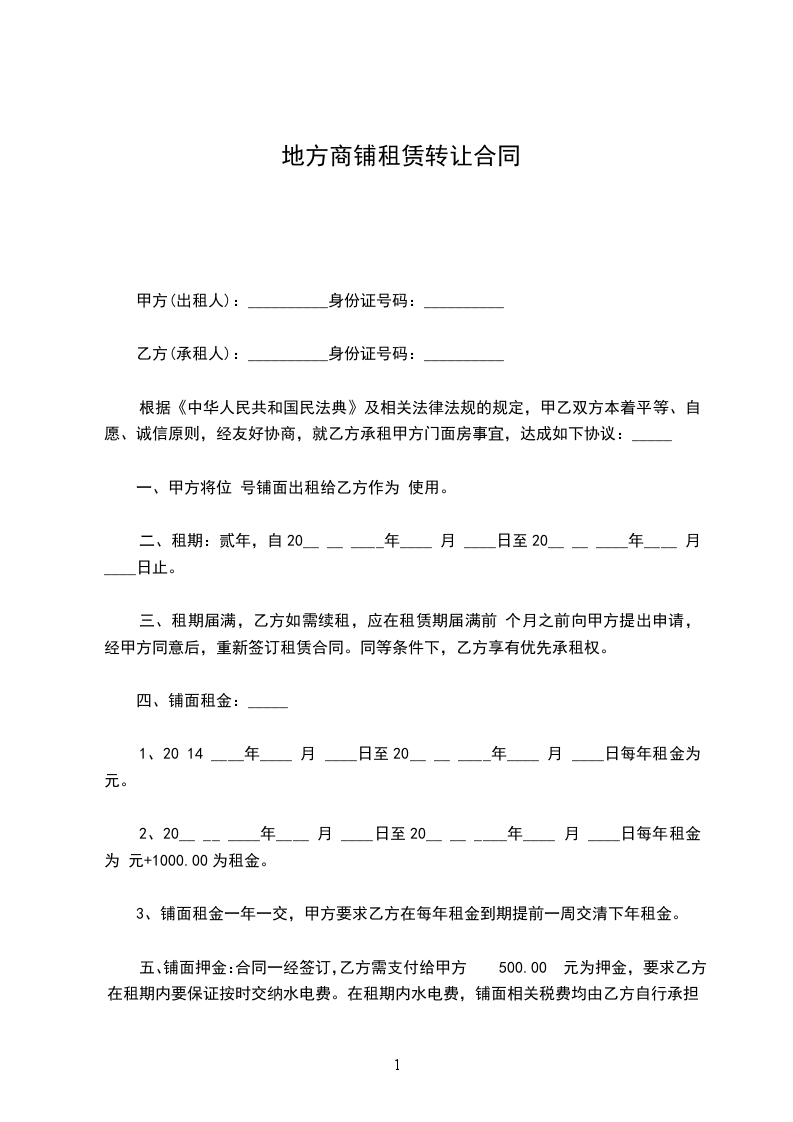 第五条乙方在前一次性向甲方支付转让费人民币大写元整,(小写:元整)上述费用不包括甲方交给乙方再转付给丙方的押金,第三条所述相关费用,甲方不得向乙方索取任何其他费用。