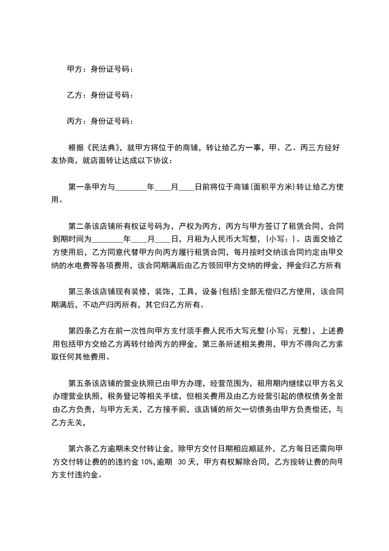 根据《民法典》,就甲方将位于的商铺,转让给乙方一事,甲、乙、丙三方经好友协商,就店面转让达成以下协议: