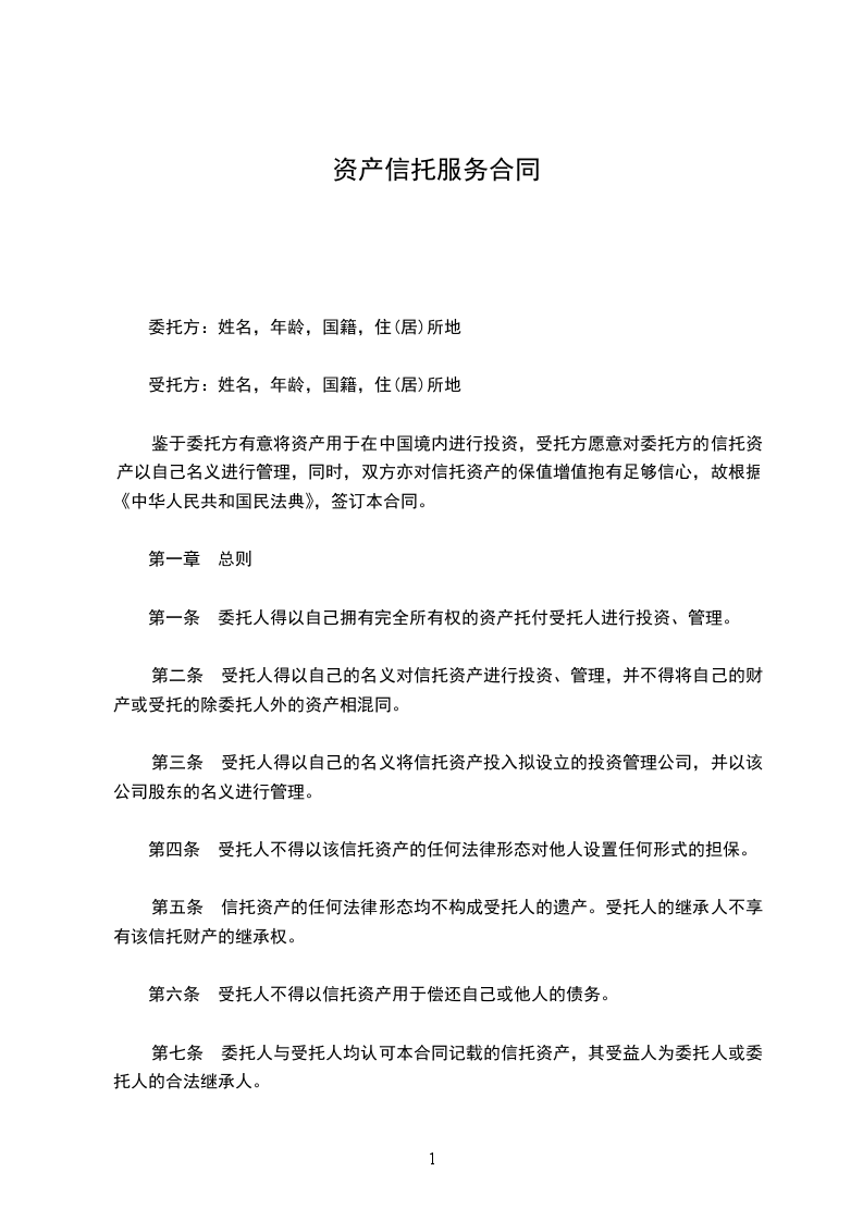 第一条?委托人得以自己拥有完全所有权的资产托付受托人进行投资、管理。