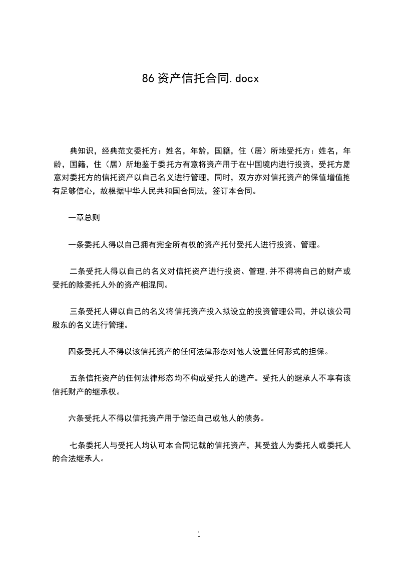 第一条 委托人得以自己拥有完全所有权的资产托付受托人进行投资、管理。