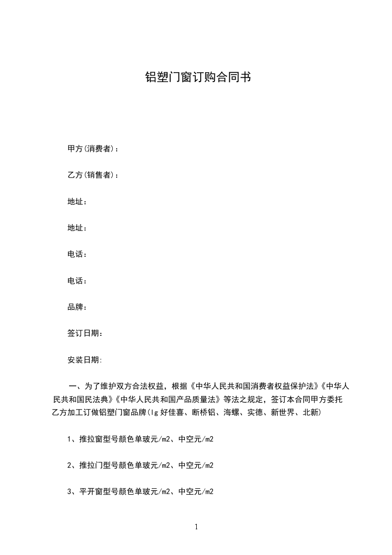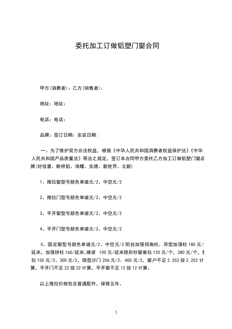 一、为了维护双方合法权益,根据《中华人民共和国消费者权益保护法》《中华人民共和国民法典》《中华人民共和国产品质量法》等法之规定,签订本合同甲方委托乙方加工订做铝塑门窗品牌(lg好佳喜、断桥铝、海螺、实德、新世界、北新)