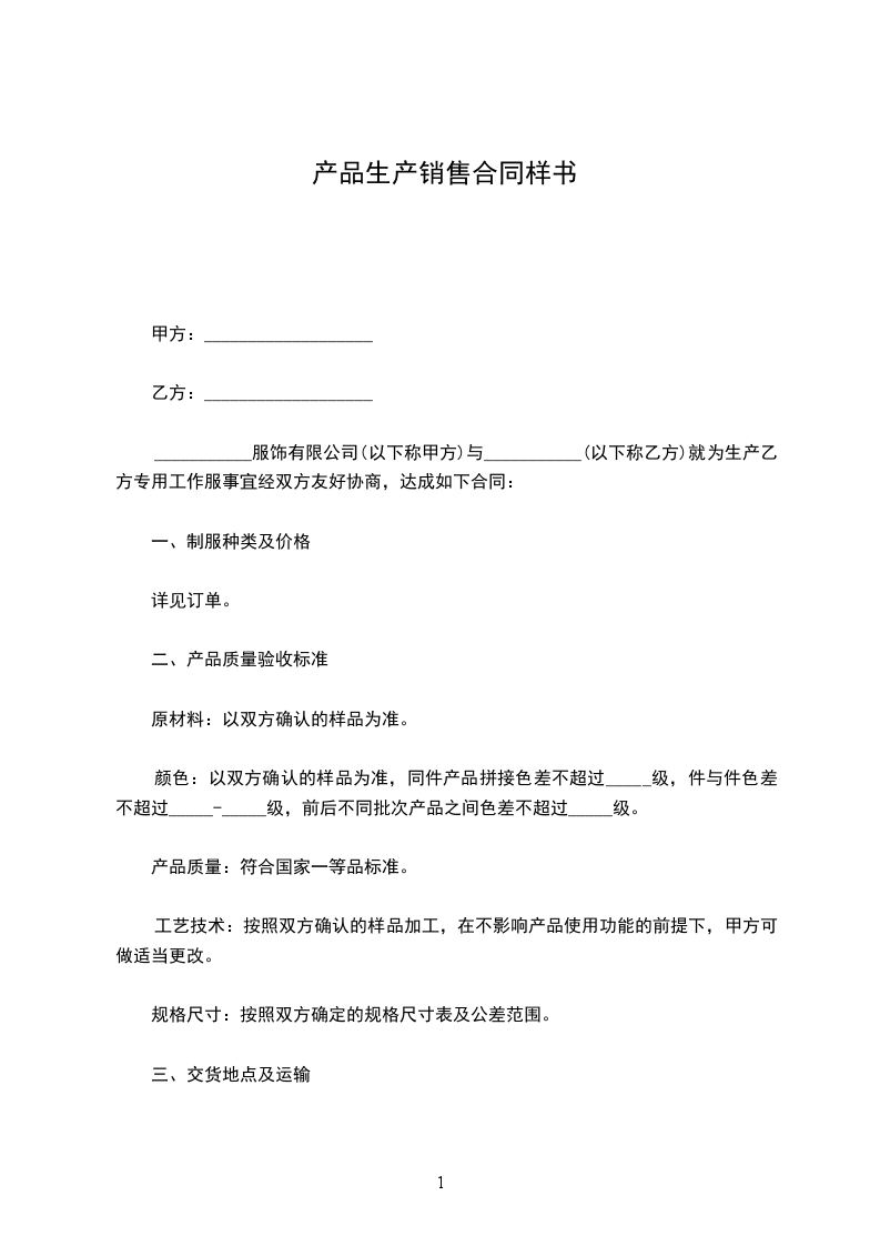 ___________服饰有限公司(以下称甲方)与___________(以下称乙方)就为生产乙方专用工作服事宜经双方友好协商,达成如下合同:
