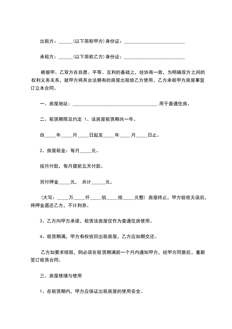 二、租赁期限及约定 1、该房屋租赁期共一年。