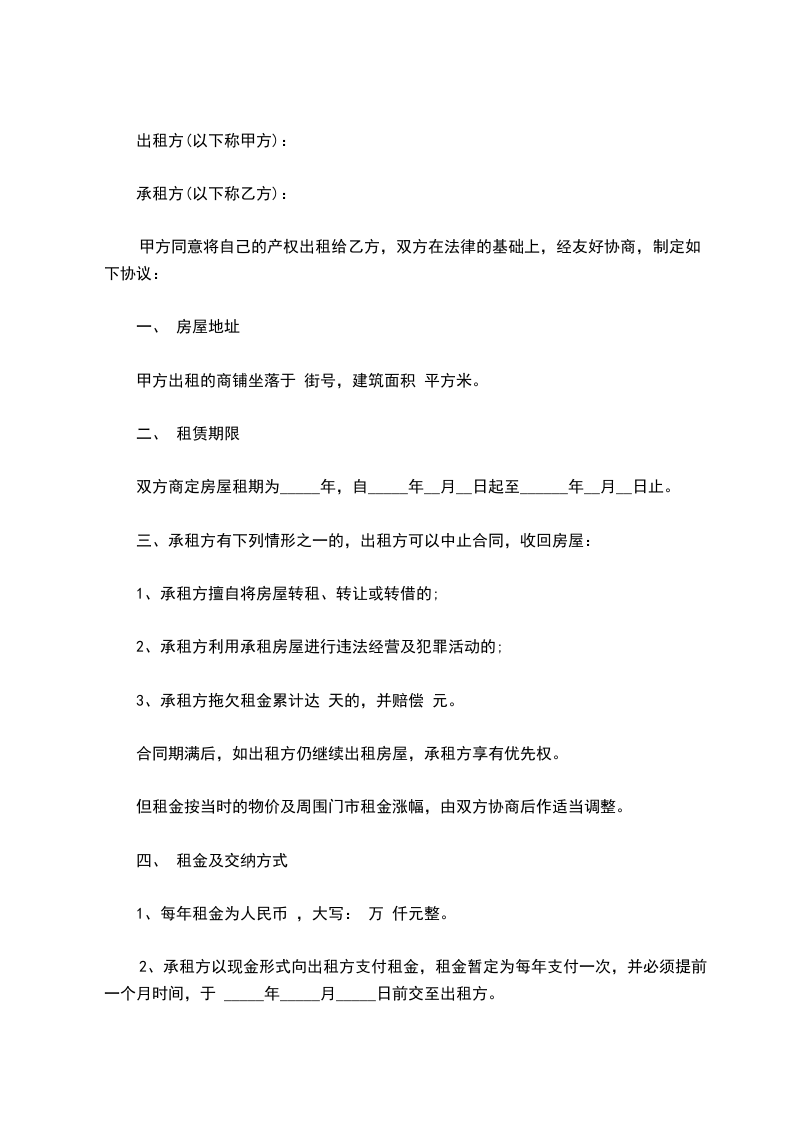1、若出租方在承租方没有违反本合同的情况下提前解除合同或租给他人,视为甲方违约,负责赔偿违约金 元。