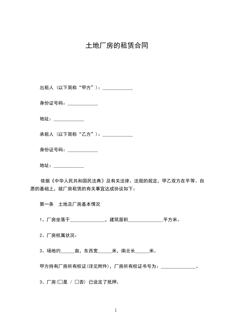 第一条 土地及厂房基本情况