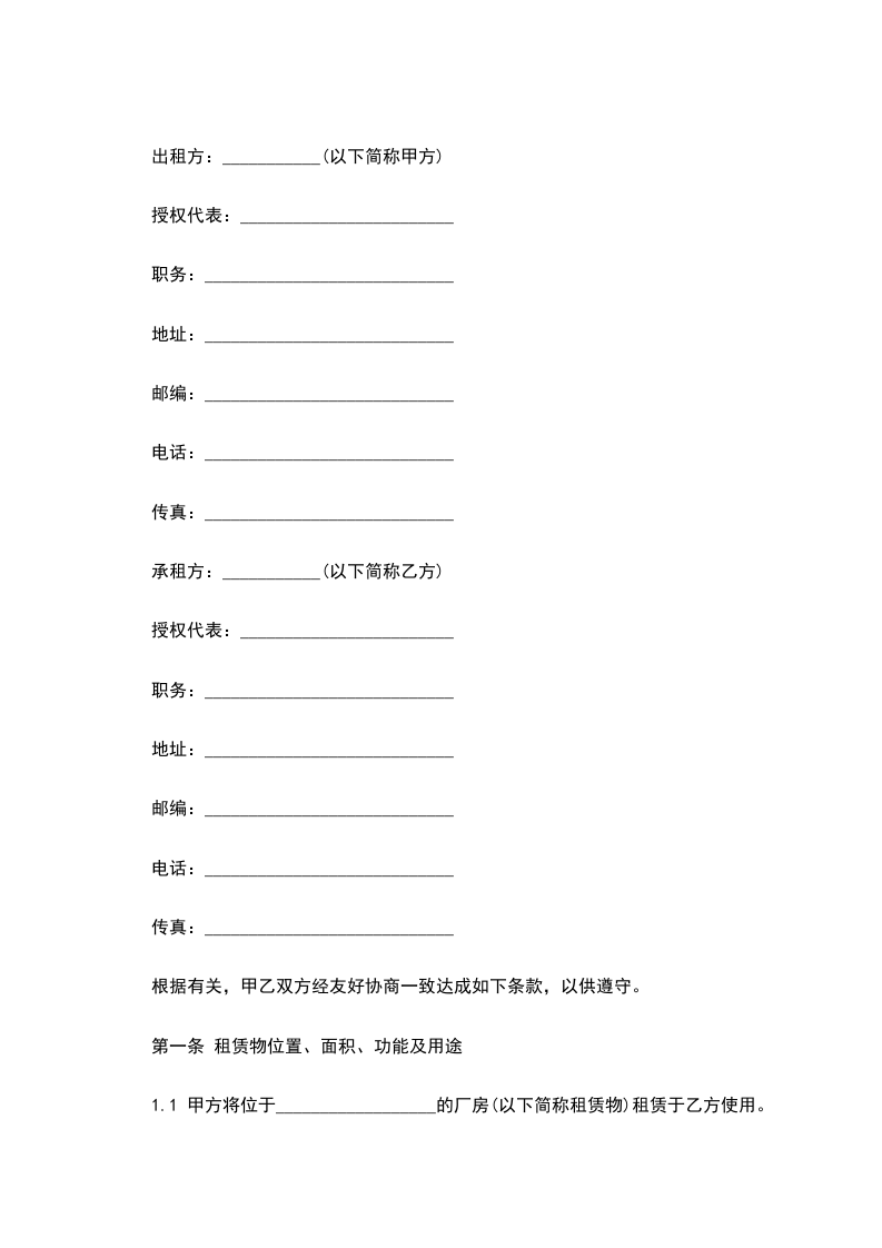1.1 甲方将位于__________________的厂房(以下简称租赁物)租赁于乙方使用。