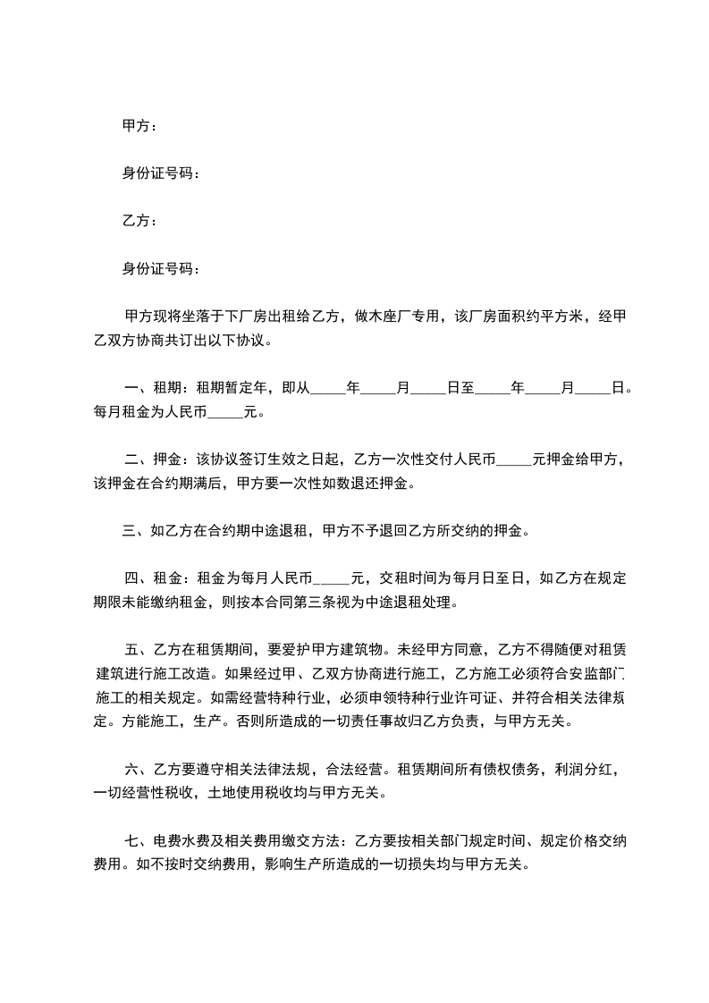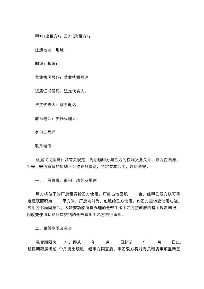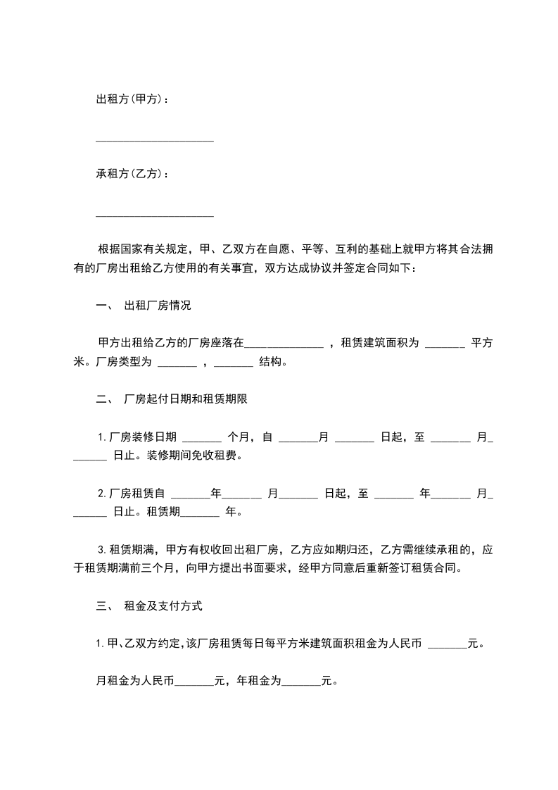 2.厂房租赁自 _______年_______ 月_______ 日起,至 _______ 年_______ 月_______ 日止。租赁期_______ 年。