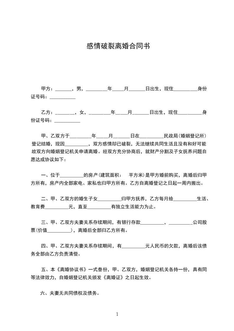 因婚后感情破裂,经双方协商一致,对有关事项,达成如下协议: