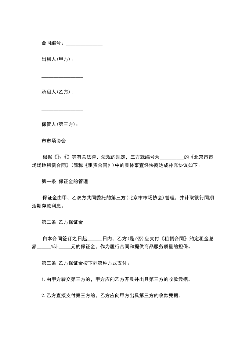 保证金由甲、乙双方共同委托的第三方(北京市市场协会)管理,并计取银行同期活期存款利息。