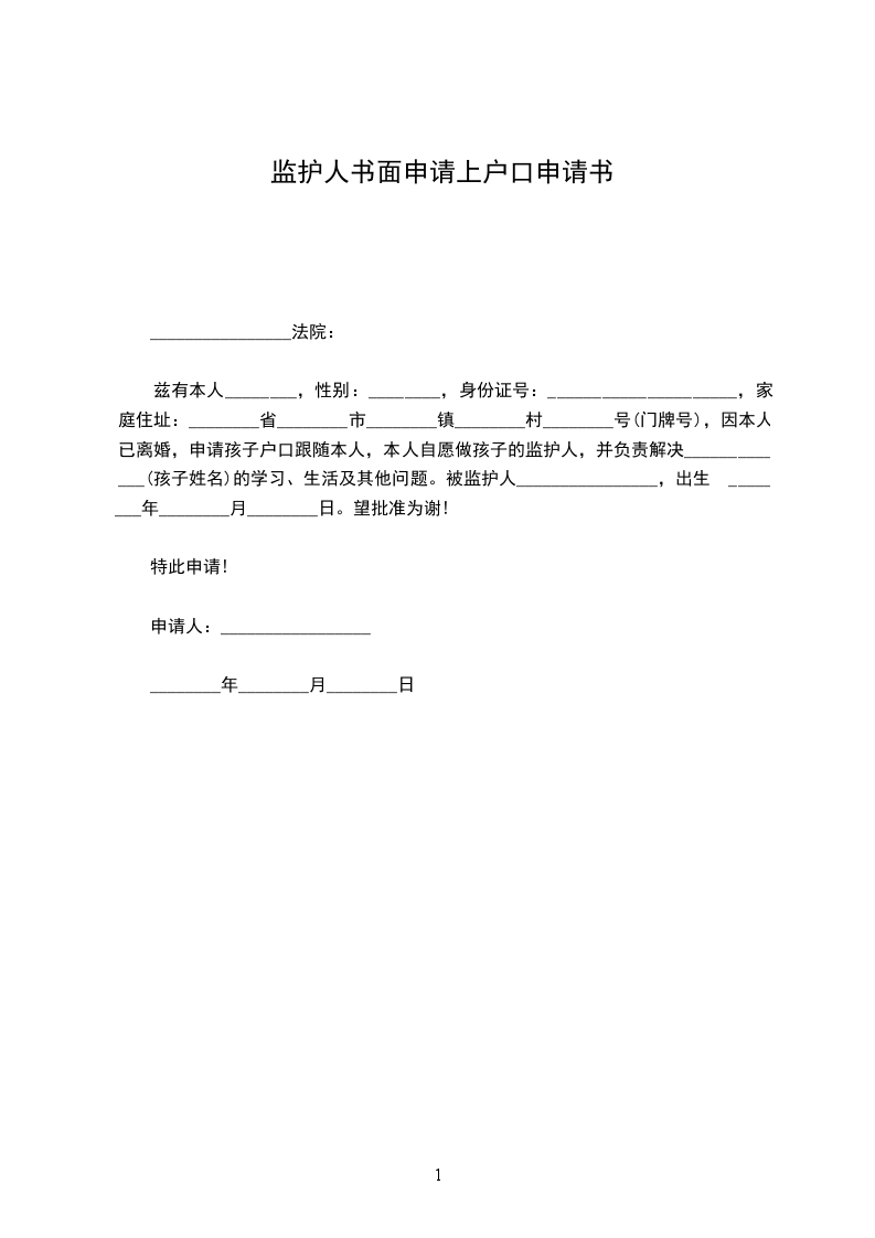 在监护人申请书模板中写关于上户口的内容时,首先需明确申请人与被申请人的关系,如父母与子女等。接着详细阐述申请上户口的原因,如出生未及时办理等。最后表达对办理上户口事宜的期望与感谢,语言要简洁明了且符合相关规定。