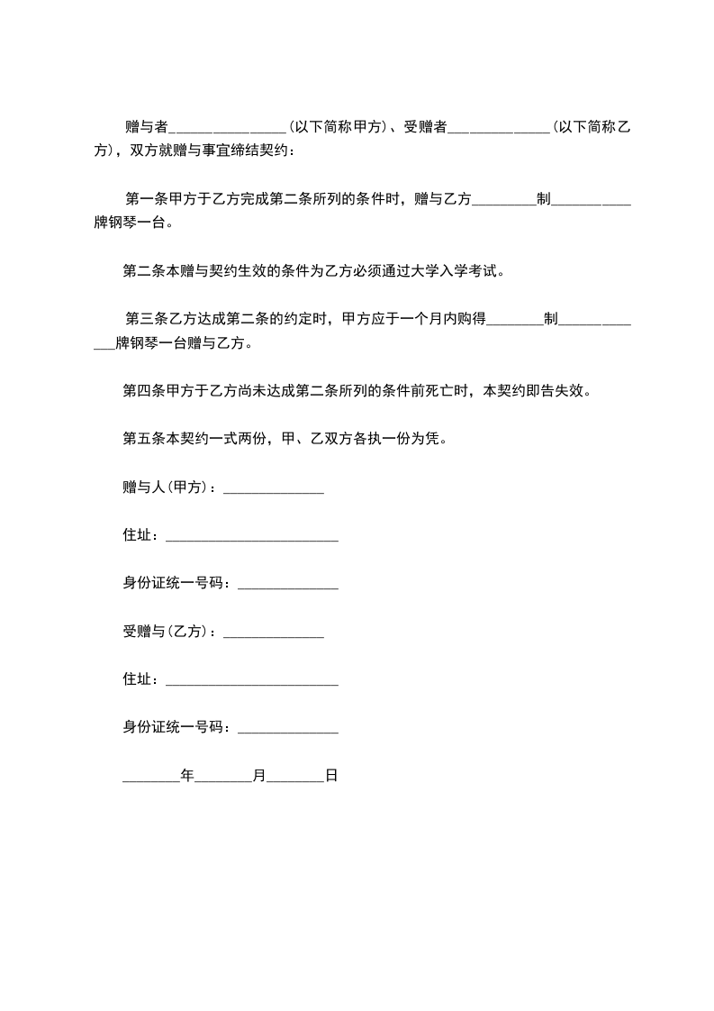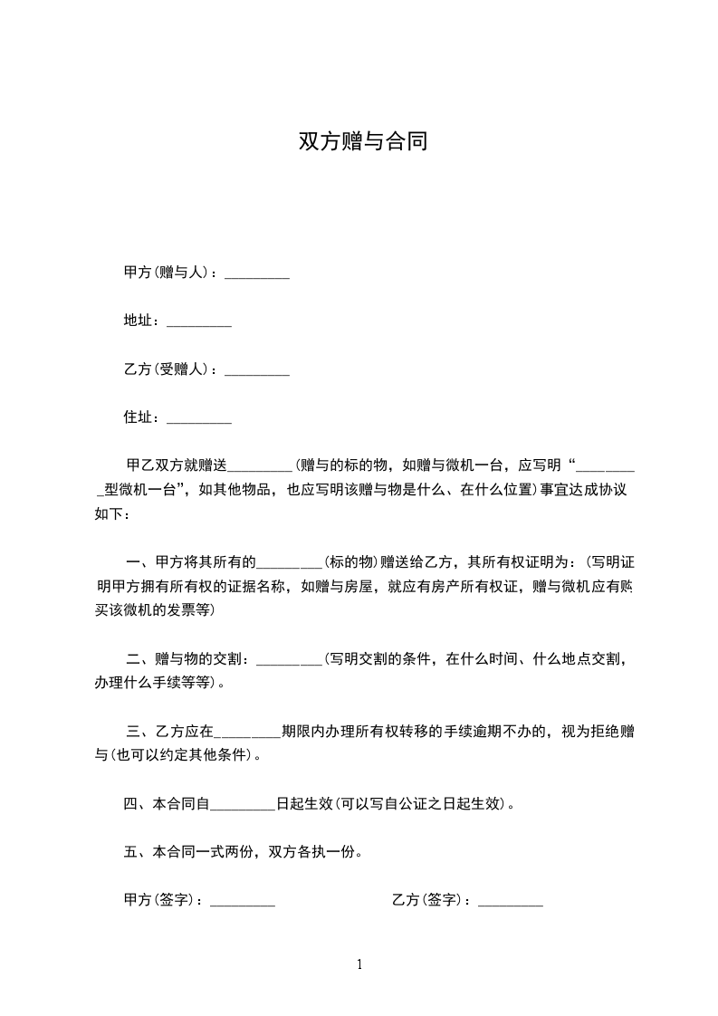 一、甲方将其所有的(标的物) 赠送给乙方,其所有权证明为:(写明证明甲方拥有所有权的证据名称,如赠与房屋,就应有房产所有权证,赠与微机应有购买该微机的发票等)
