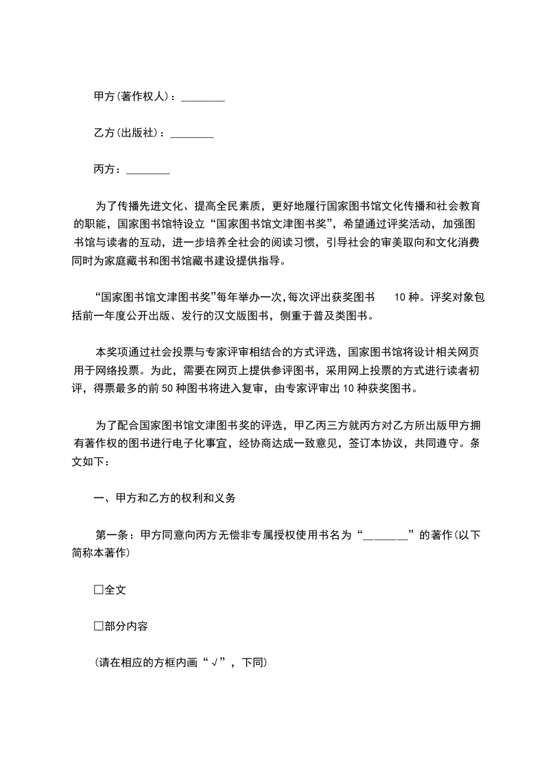 甲方(著作权人或著作权代理人):乙方(出版者):