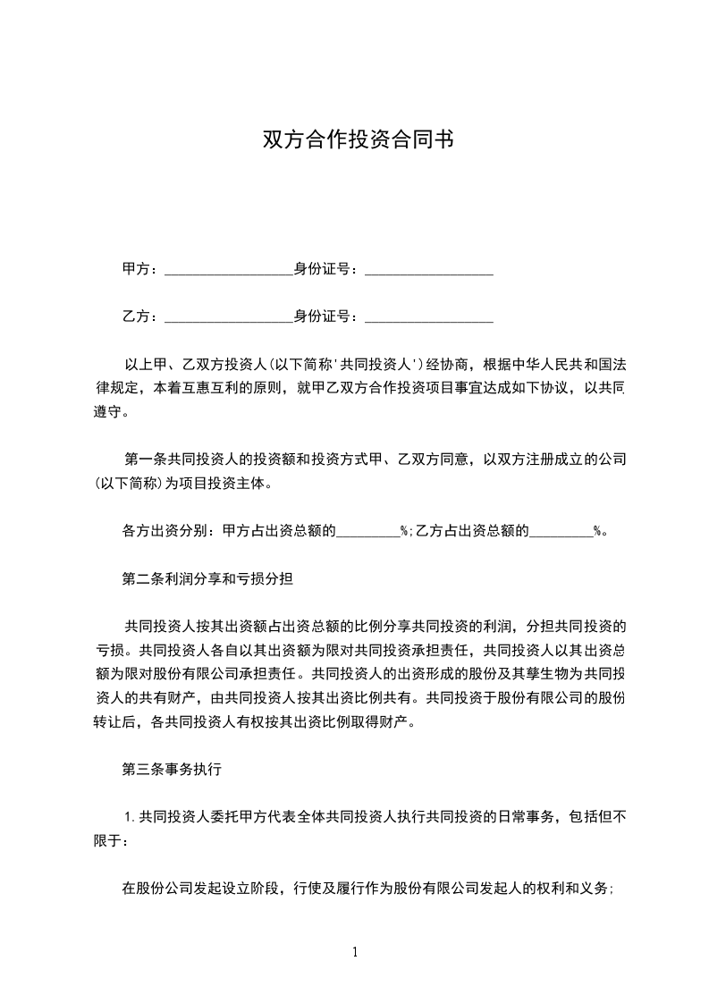 以上甲、乙双方投资人(以下简称'共同投资人')经协商,根据中华人民共和国法律规定,本着互惠互利的原则,就甲乙双方合作投资项目事宜达成如下协议,以共同遵守。