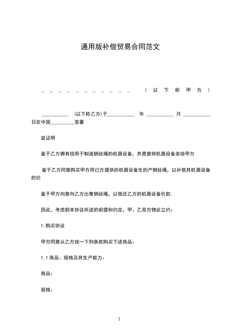 说明:本部分“补偿贸易合同”的适用法律、法规参照“国际货物贸易合同”中的有关法律、法规。_________补偿贸易设备进口合同合同号____本合同在_________协议基础上签订,中国_________公司(以下简称买方)向_________国_________公司(以下简称卖方)购进_________设备,其交易条件如下: