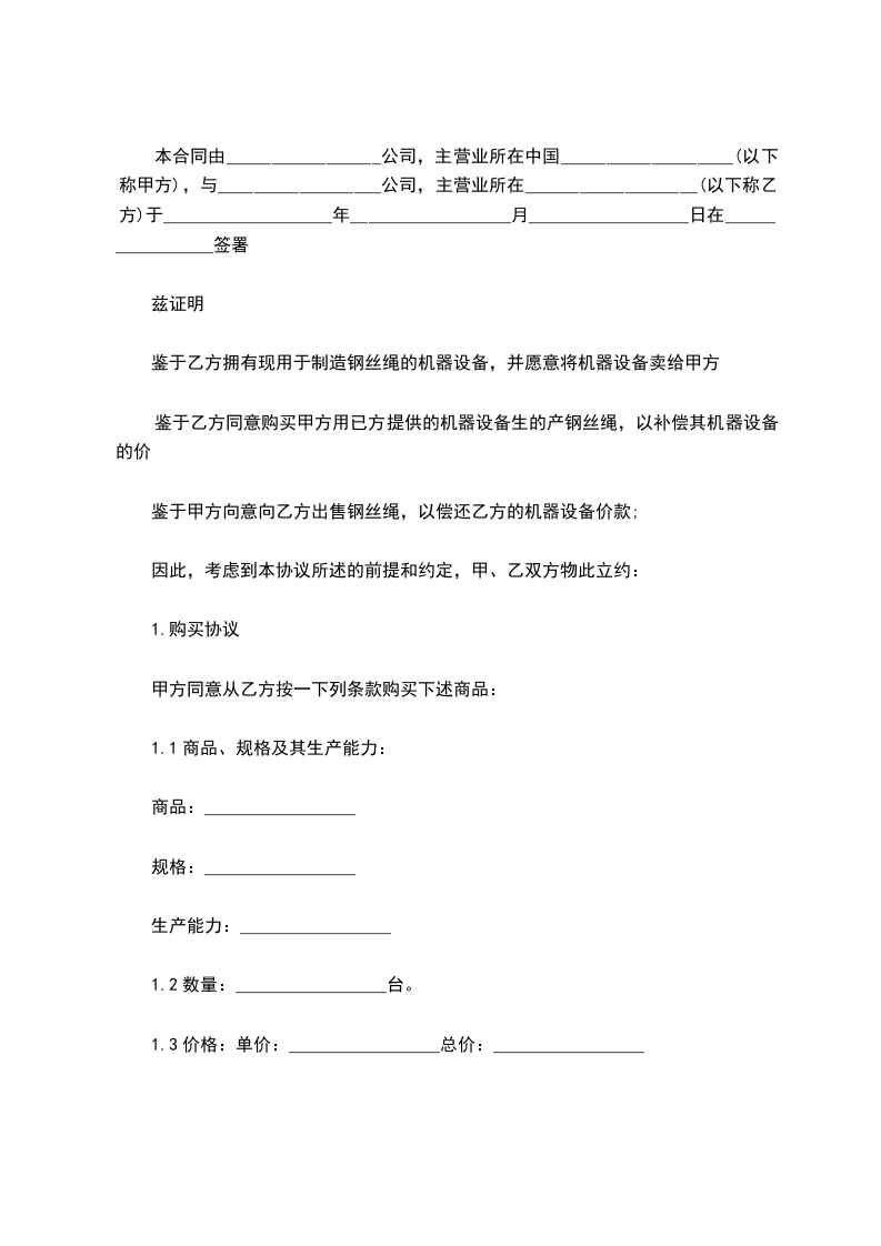 第一条 甲方同意从 年 月份起至 年 月底止,分期分批向乙方提供产品 套(件),计总值 万美元。