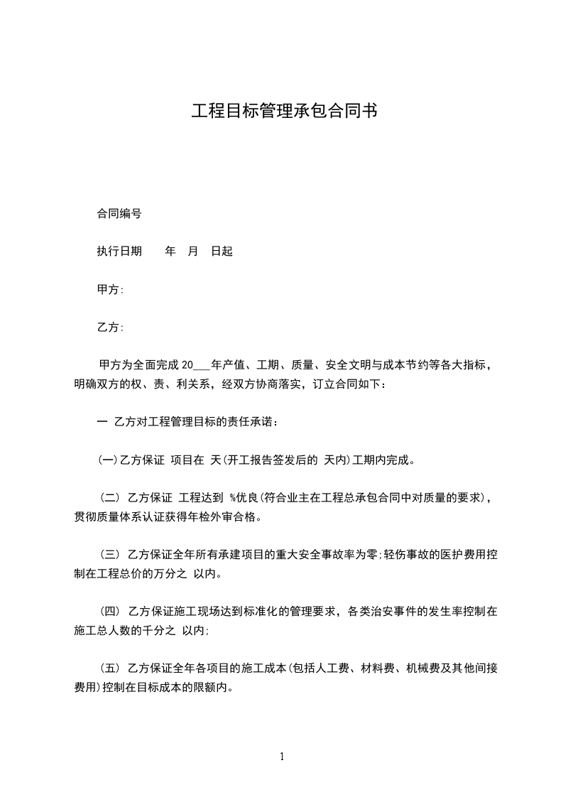 甲方为全面完成20___年产值、工期、质量、安全文明与成本节约等各大指标,明确双方的权、责、利关系,经双方协商落实,订立合同如下: