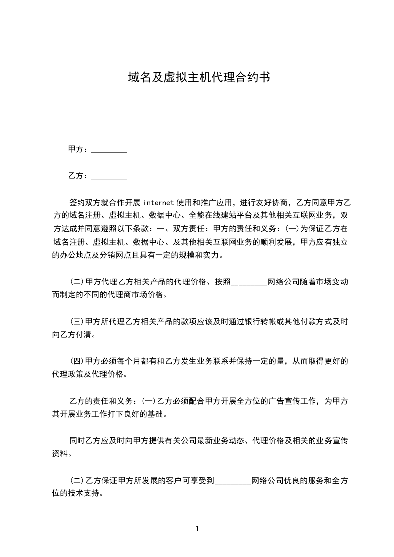 签约双方就合作开展internet使用和推广应用,进行友好协商,乙方同意甲方乙方的域名注册、虚拟主机、数据中心、全能在线建站平台及其他相关互联网业务,双方达成并同意遵照以下条款:一、双方责任:甲方的责任和义务:(一)为保证乙方在域名注册、虚拟主机、数据中心、及其他相关互联网业务的顺利发展,甲方应有独立的办公地点及分销网点且具有一定的规模和实力。