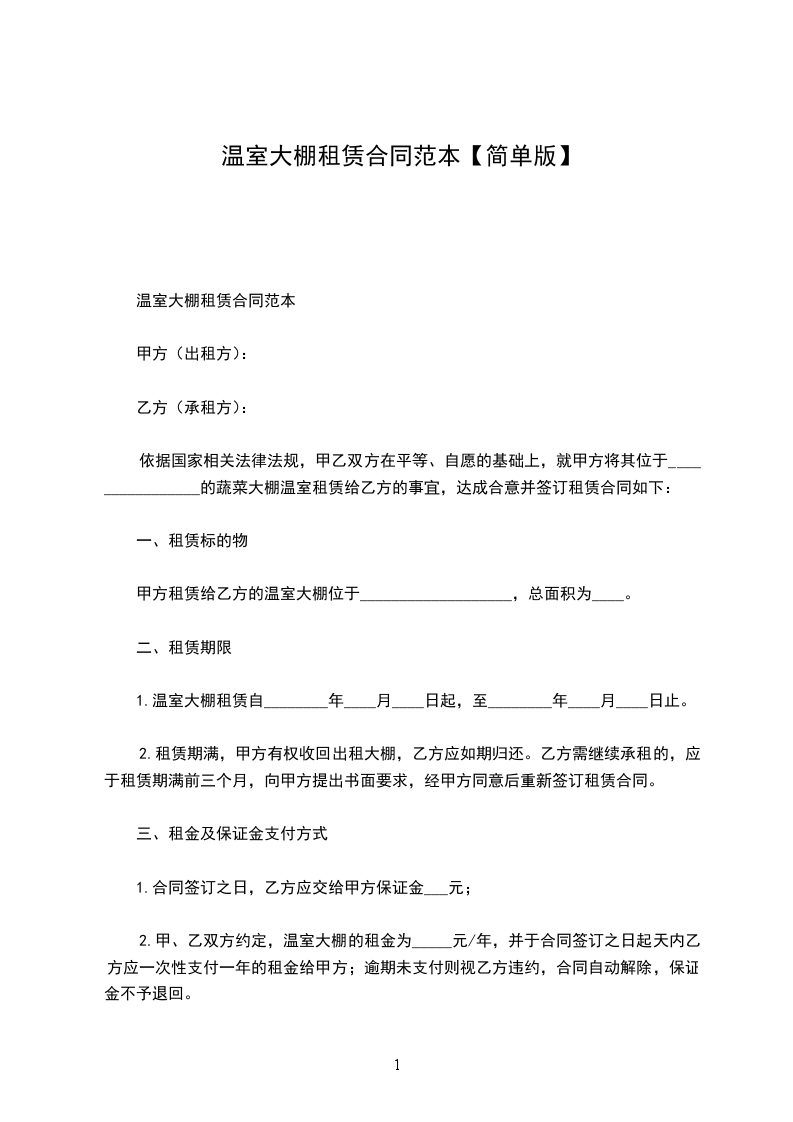 一份简单的大棚租赁合同,旨在明确双方在大棚使用及租赁方面的权利和义务。它涵盖了租赁期限、租金支付、大棚维护等重要条款,为租赁双方提供了清晰的合作框架,保障双方的合法权益。你是否在寻找一份简单易懂的大棚租赁合同呢?这份合同将为你清晰呈现租赁的各项细节,让你在与对方合作时心中有数,避免不必要的纠纷,快来看看吧!