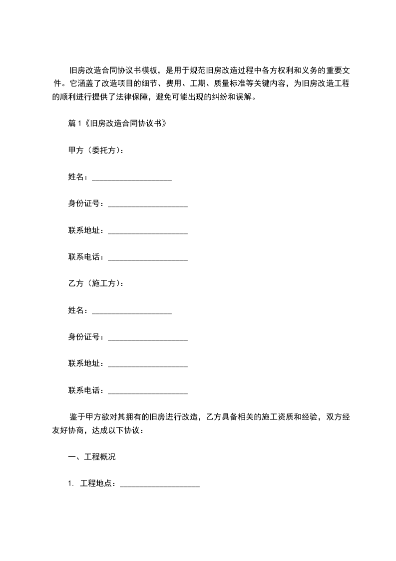 鉴于甲方拥有位于________________(地址)的旧房,拟进行改造工程,乙方具备相关施工资质和经验,双方经友好协商,达成以下协议: