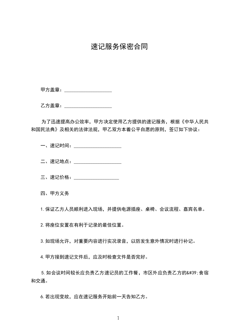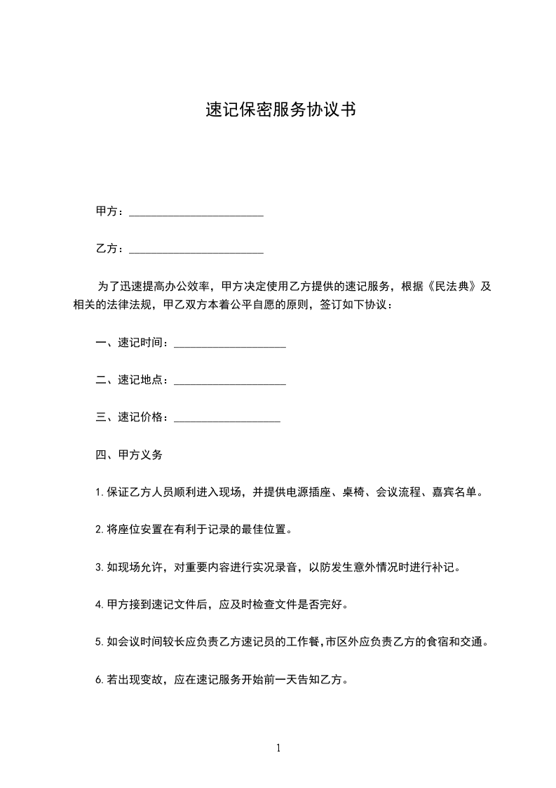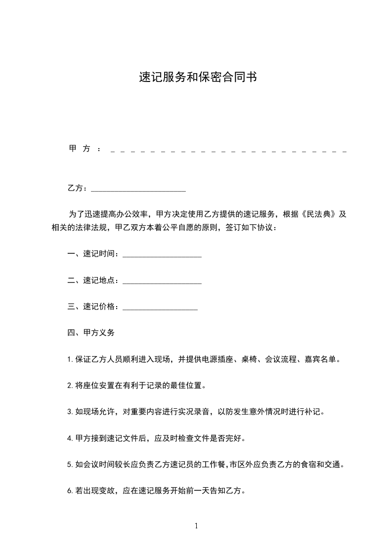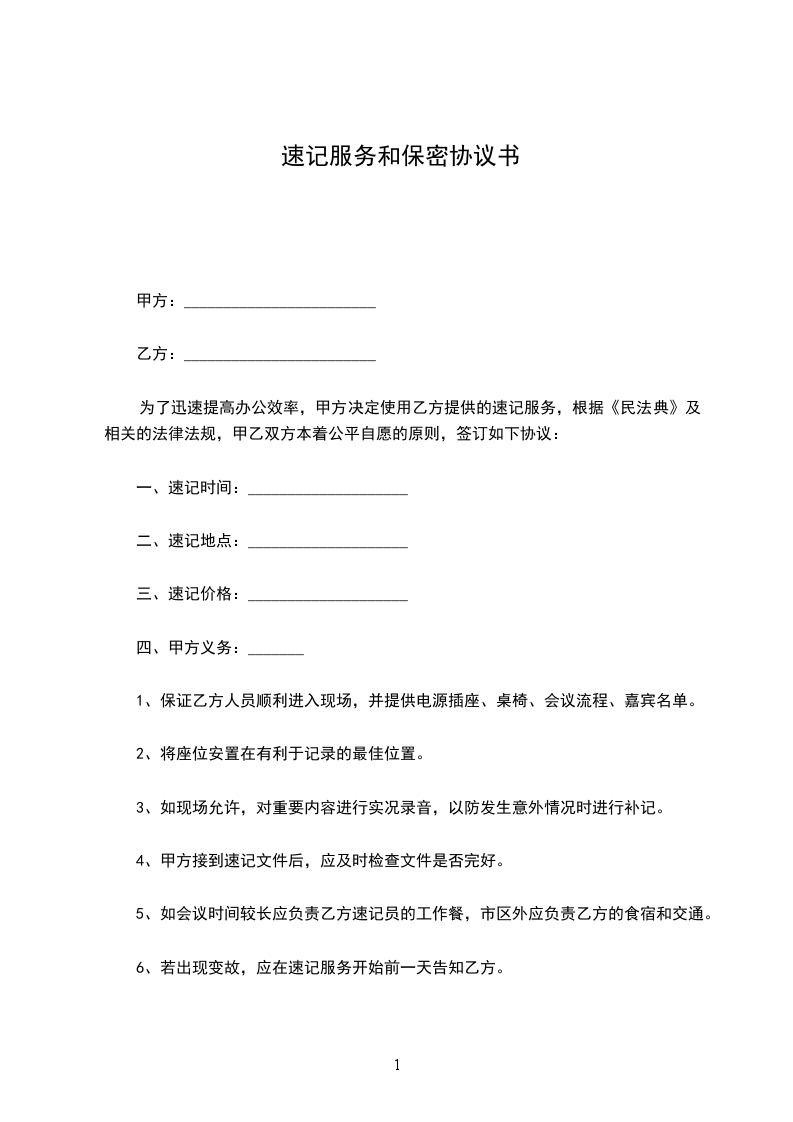 为了迅速提高办公效率,甲方决定使用乙方提供的速记服务,根据《中华人民共和国民法典》及相关的法律法规,甲乙双方本着公平自愿的原则,签订如下协议: