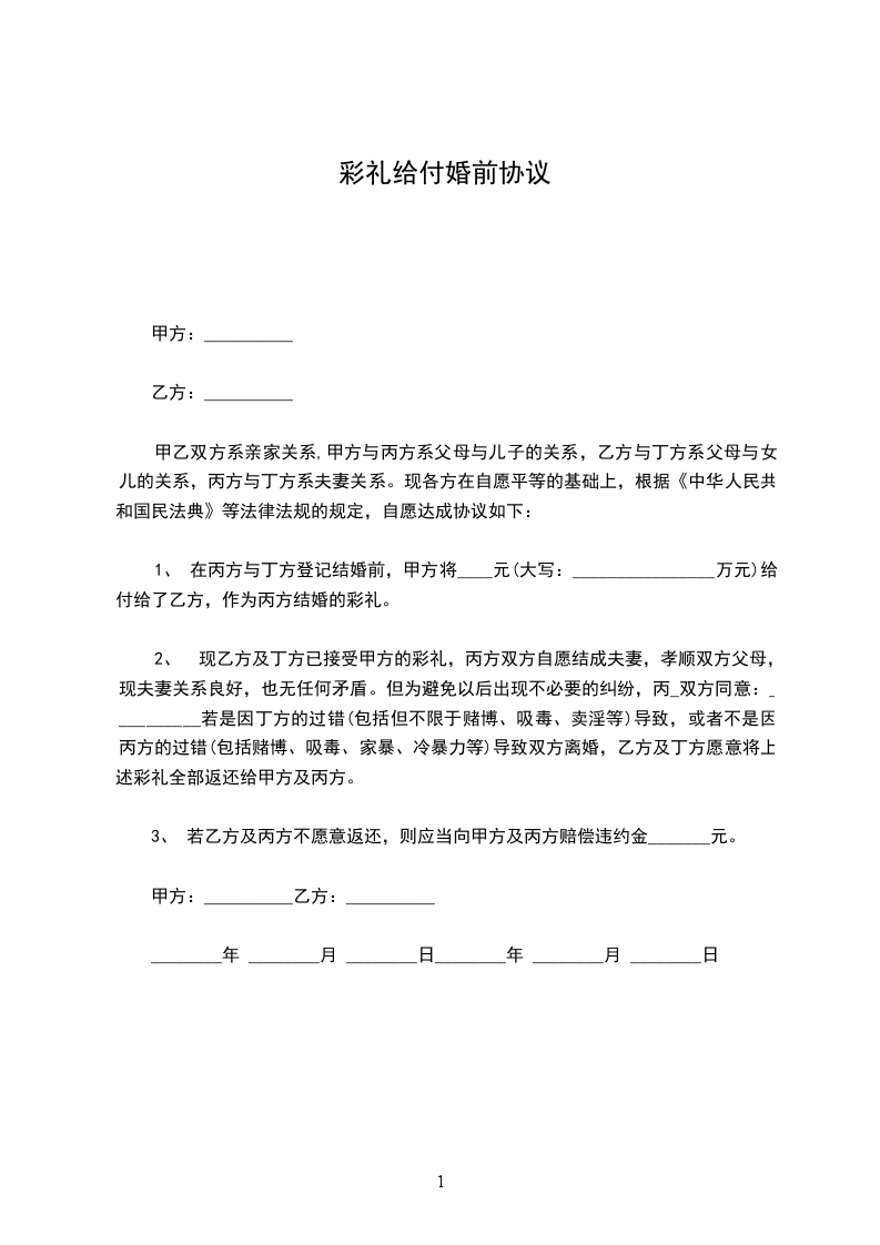1. 甲方自愿向乙方支付彩礼人民币______元(大写______元)。