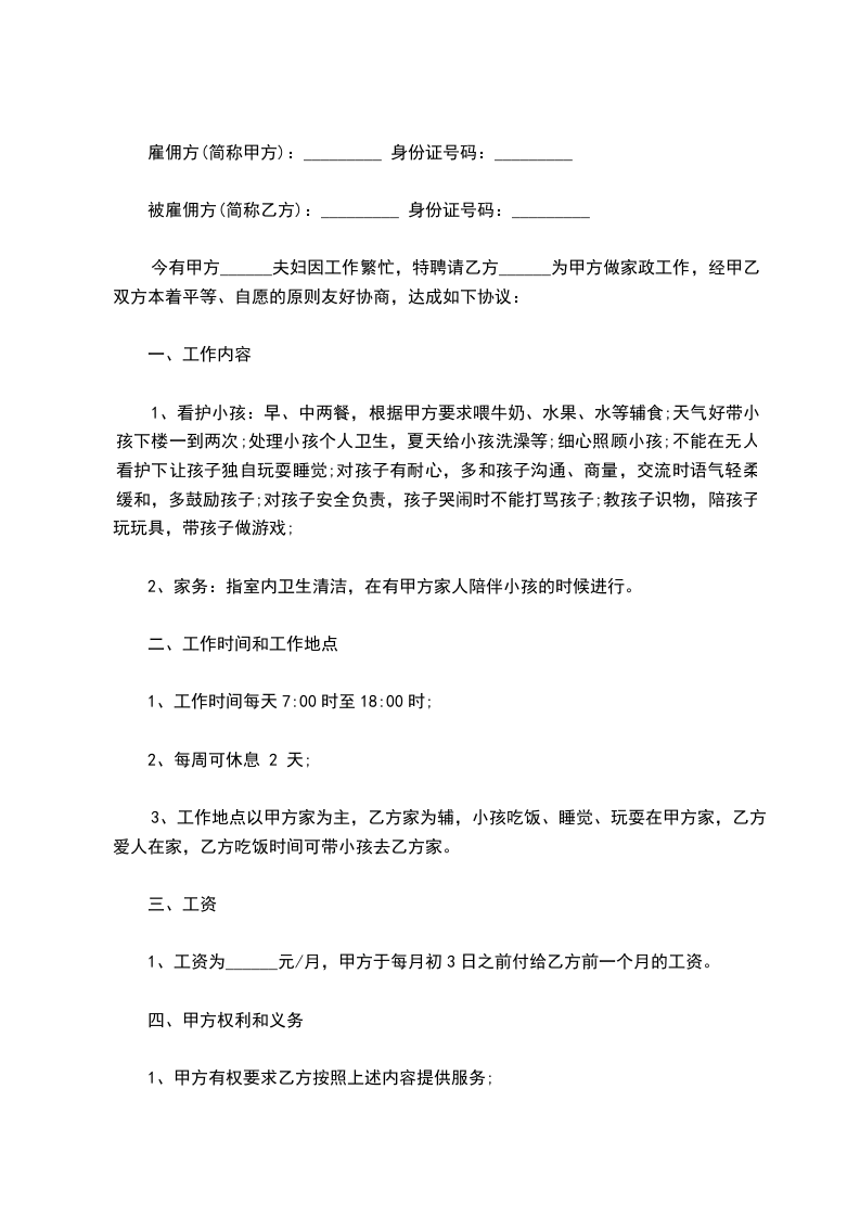 8、家务劳动:根据甲方提出的要求做饭、房屋卫生清洁、洗衣服;