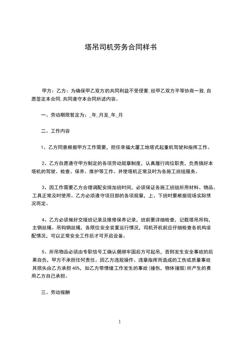 一、劳务期限:从____年____月____日开始算起,至塔吊作业完成时止。