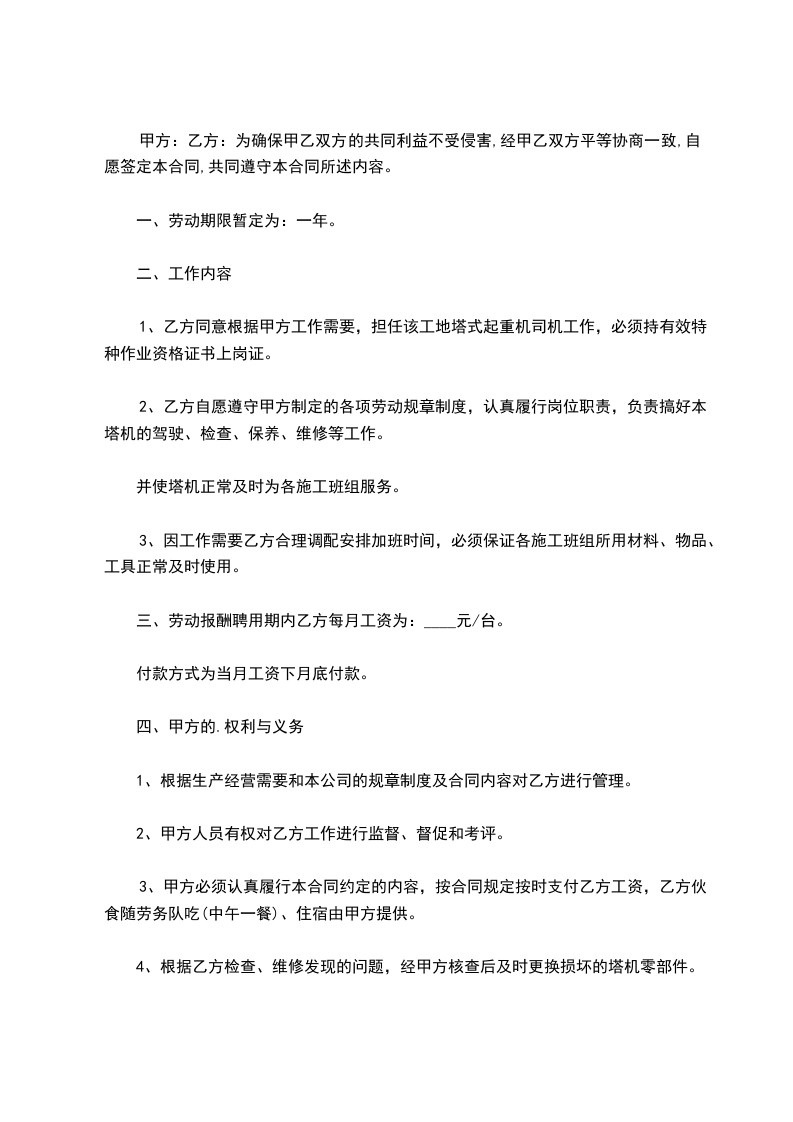4、乙方保证每台塔吊配备经验丰富的持证操作工,所有人员证件交甲方备案上岗。乙方必需保证人员长期稳定,甲方不准随意调换或无故辞职。