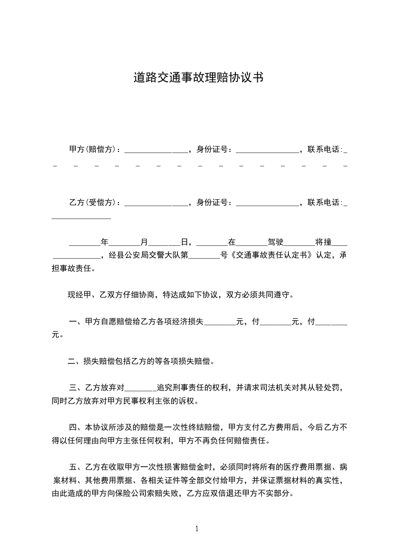 年 月 日,甲方与乙方号牌车(保险单号码:)发生交通事故(事故认定书编号:),造成甲方受伤,经交警部门认定,甲方负责任,乙方负责任。