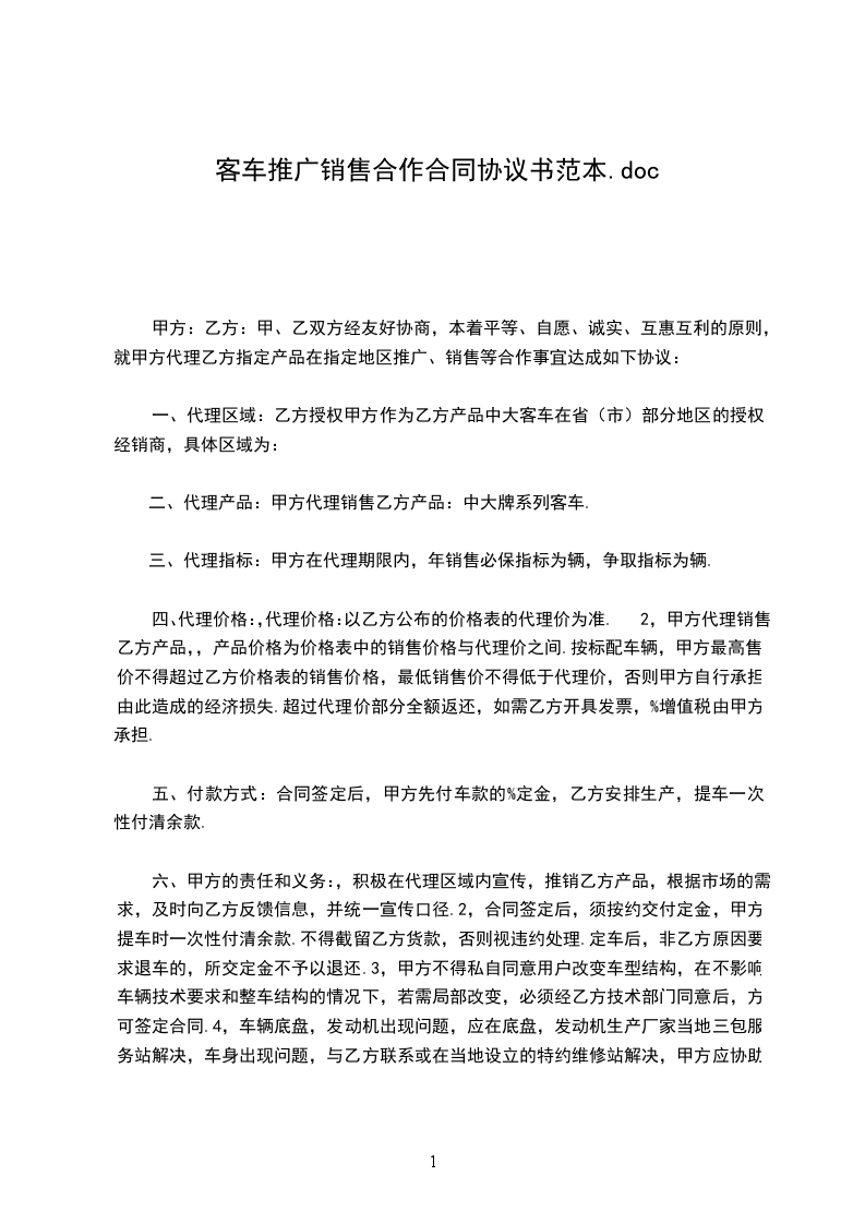 5.甲方积极为需购乙方产品的客户办理购车按揭付款业务,以促进乙方产品在代理区域内的销售。