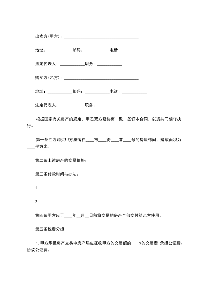 第一条乙方购买甲方座落在____市____街____巷____号的房屋栋间,建筑面积为____平方米。