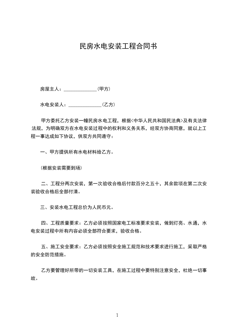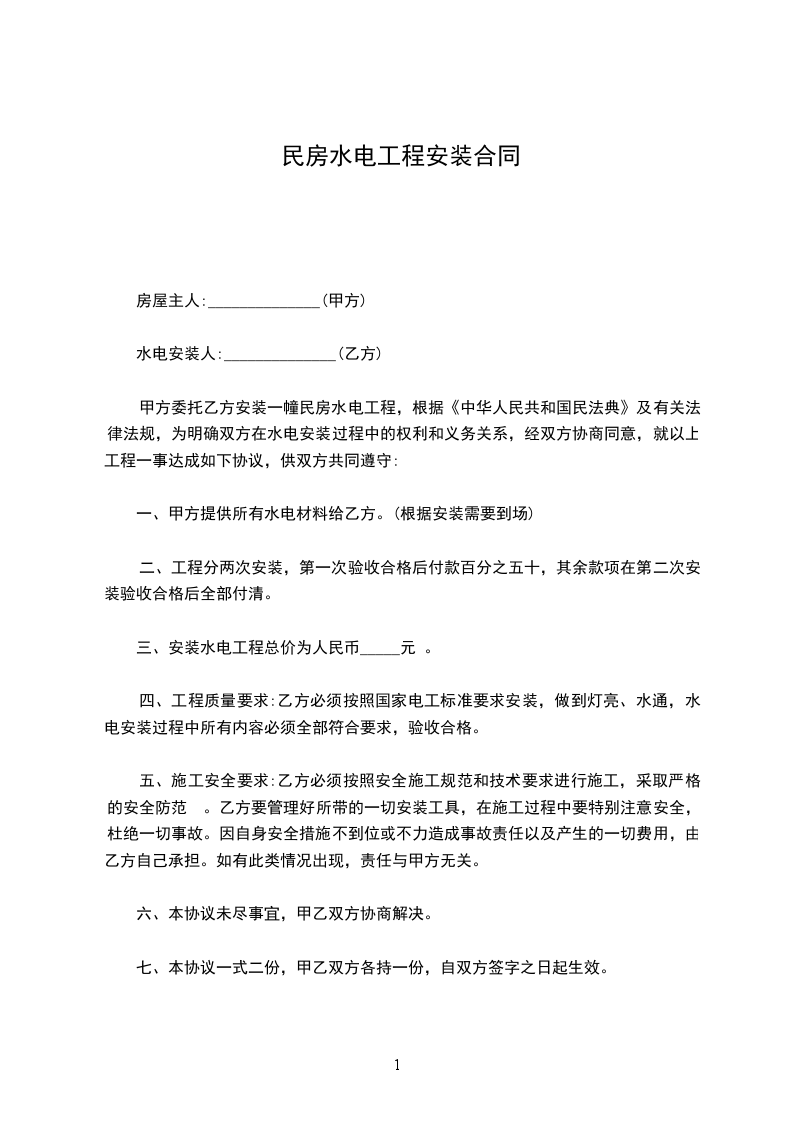 甲方委托乙方安装一幢民房水电工程,根据及有关法律法规,为明确双方在水电安装过程中的权利和义务关系,经双方协商同意,就以上工程一事达成如下协议,供双方共同遵守: