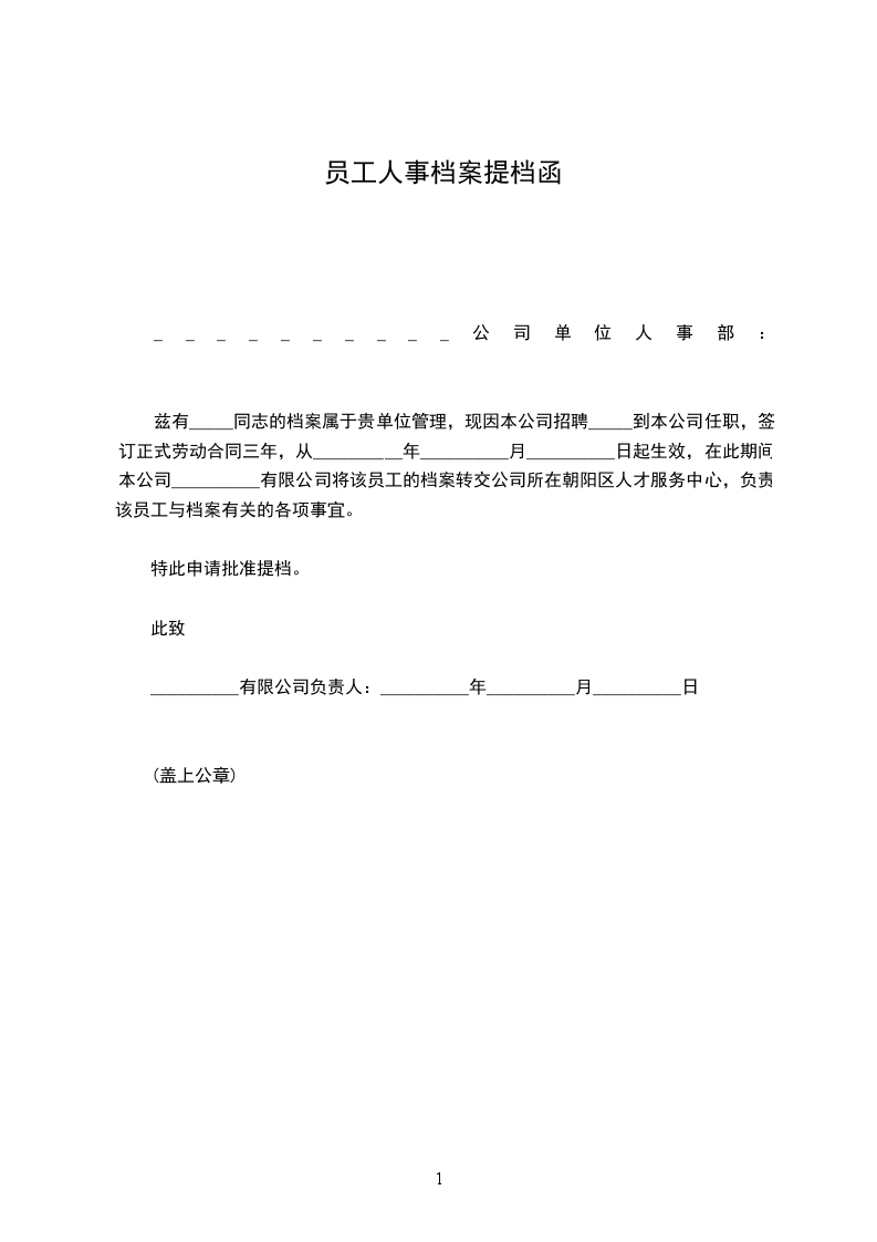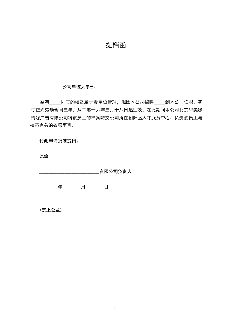 兹有_____同志的档案属于贵单位管理,现因本公司招聘_____到本公司任职,签订正式劳动合同三年,从二零一六年三月十八日起生效,在此期间本公司北京华美缘传媒广告有限公司将该员工的档案转交公司所在朝阳区人才服务中心,负责该员工与档案有关的各项事宜。