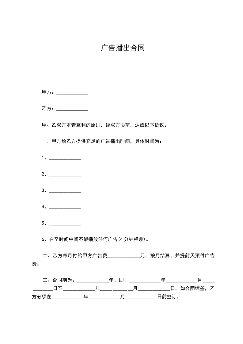 四、在每次播出乙方广告的时段_____________分钟(时分),乙方占用广告时间至_____________分钟。