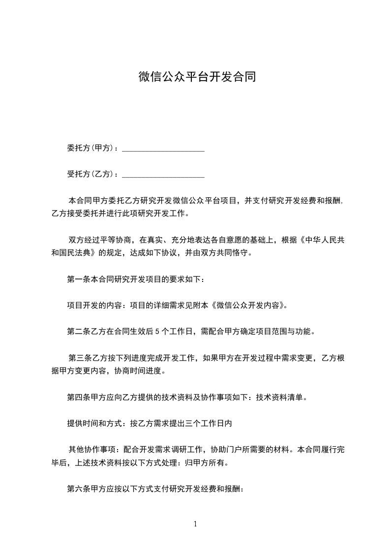 本合同甲方委托乙方研究开发微信公众平台项目,并支付研究开发经费和报酬,乙方接受委托并进行此项研究开发工作。