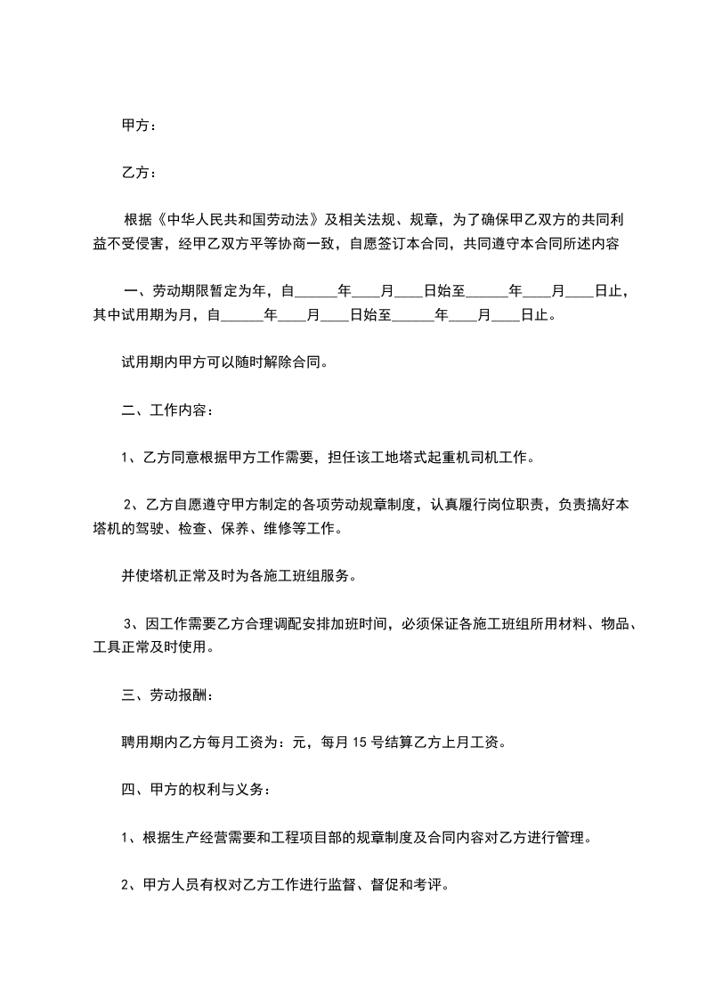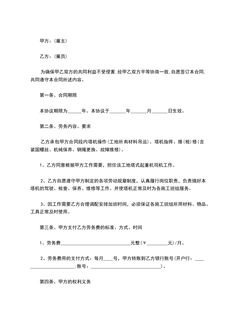 一、劳务期限:从_____年_____月_____日开始算起,至塔吊作业完成时止。