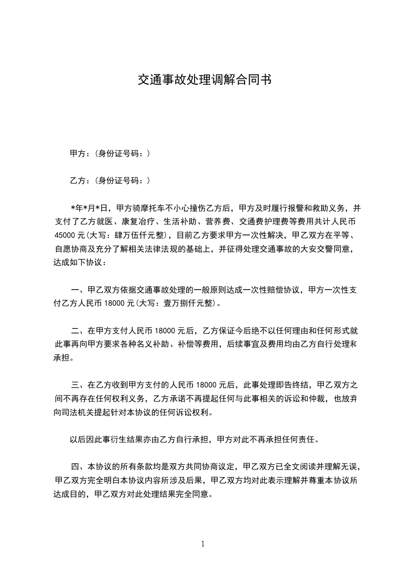 _____年_____月_____日,甲方骑摩托车不小心撞伤乙方后,甲方及时履行报警和救助义务,并支付了乙方就医、康复冶疗、生活补助、营养费、交通费护理费等费用共计人民币45000元(大写:肆万伍仟元整),目前乙方要求甲方一次性解决,甲乙双方在平等、自愿协商及充分了解相关法律法规的基础上,并征得处理交通事故的大安交警同意,达成如下协议:
