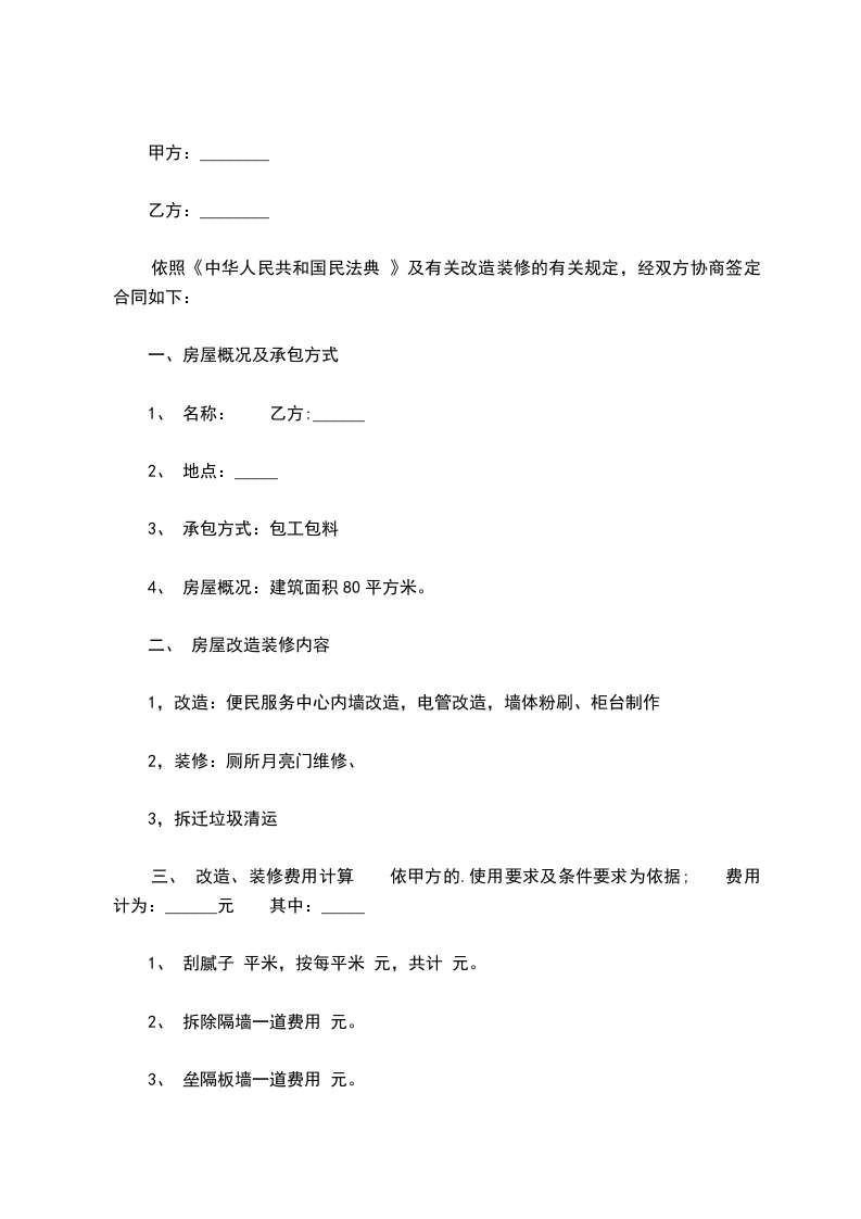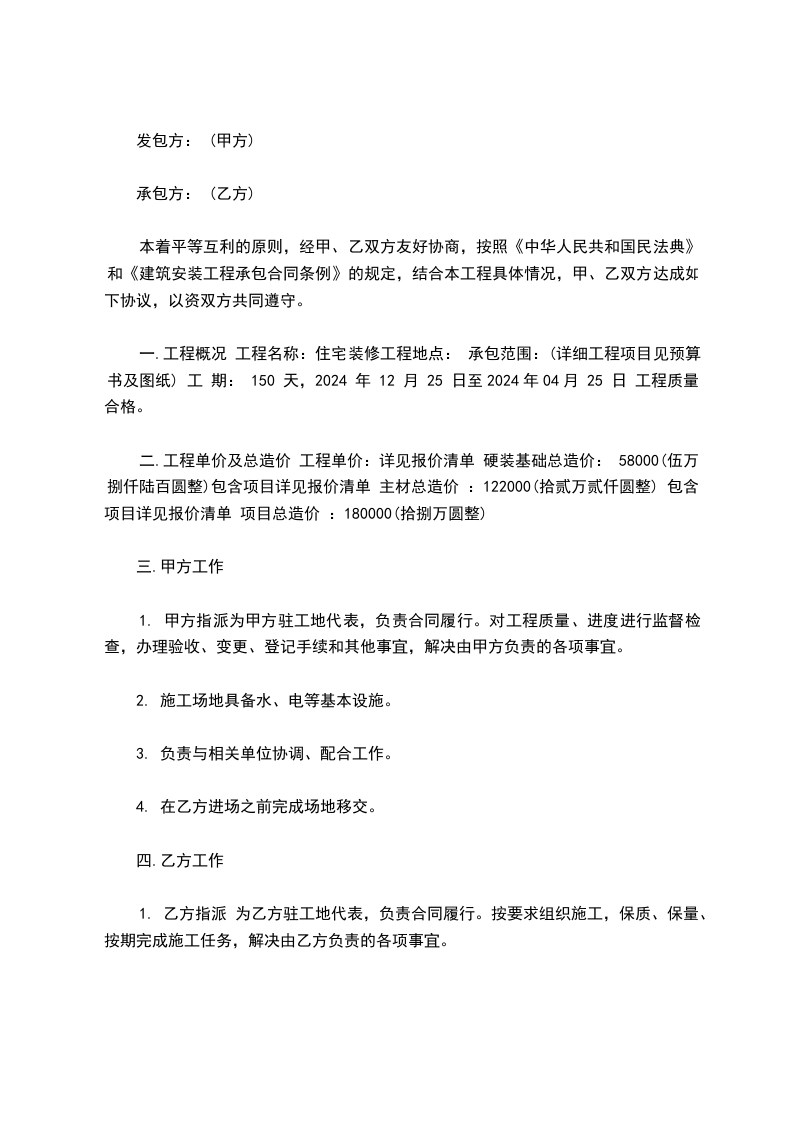 一.工程概况 工程名称:住宅装修工程地点: 承包范围:(详细工程项目见预算书及图纸) 工 期: 150 天,2024 年 12 月 25 日至2024年04月 25 日 工程质量:合格。