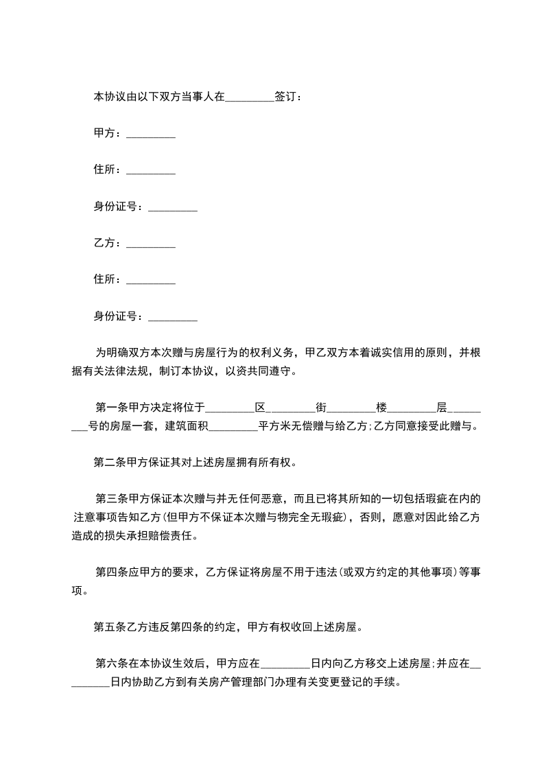 第一条甲方决定将位于_________区_________街_________楼_________层_________号的房屋一套,建筑面积_________平方米无偿赠与给乙方;乙方同意接受此赠与。