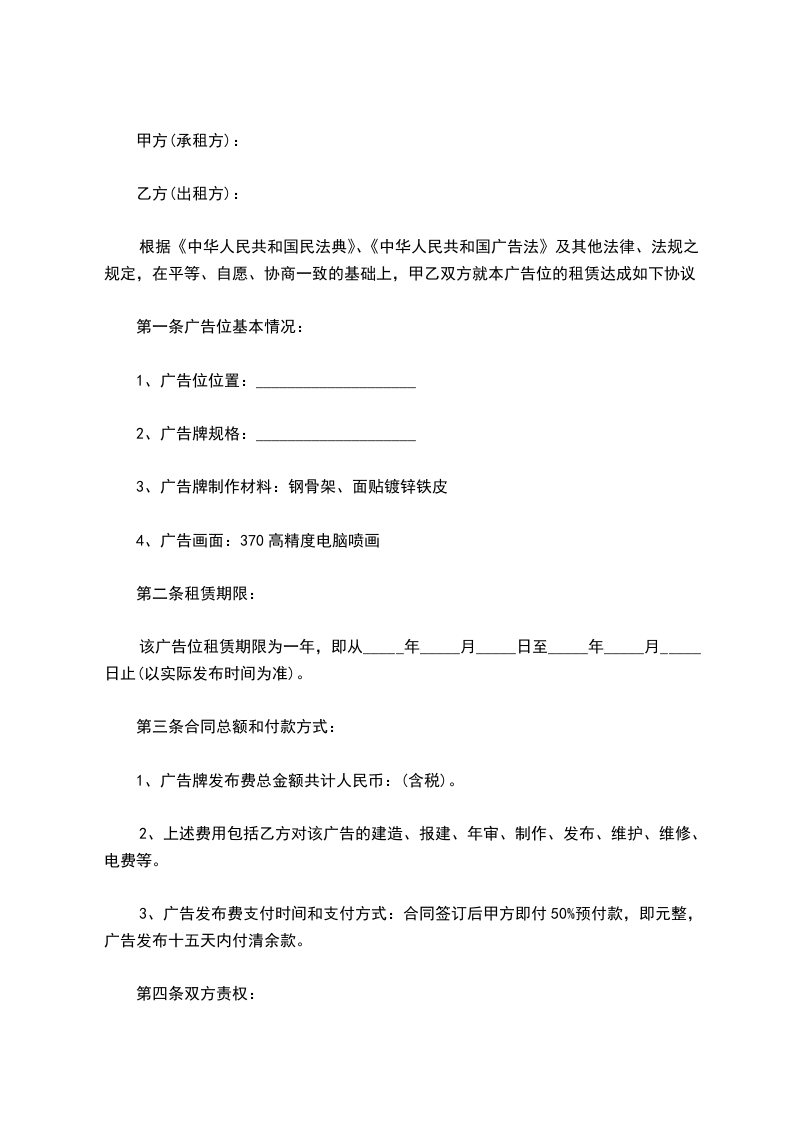 根据《中华人民共和国民法典》、《中华人民共和国广告法》及其他法律、法规之规定,在平等、自愿、协商一致的基础上,甲乙双方就本广告位的租赁达成如下协议: