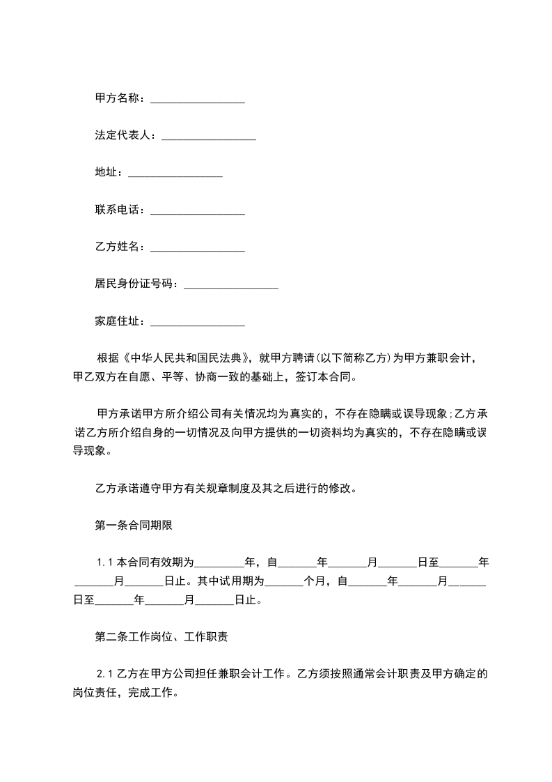 根据《中华人民共和国民法典》,就甲方聘请(以下简称乙方)为甲方兼职会计,甲乙双方在自愿、平等、协商一致的基础上,签订本合同。