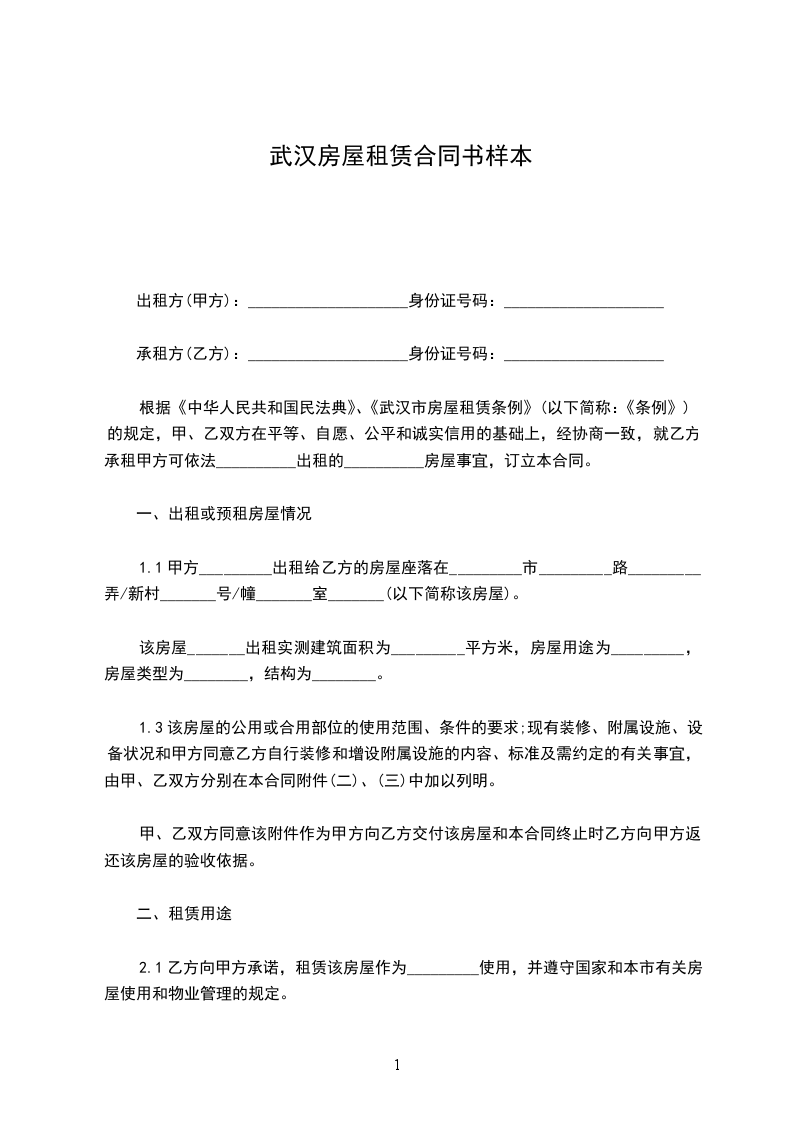 根据《中华人民共和国民法典》、《武汉市房屋租赁条例》(以下简称:《条例》)的规定,甲、乙双方在平等、自愿、公平和诚实信用的基础上,经协商一致,就乙方承租甲方可依法__________出租的__________房屋事宜,订立本合同。