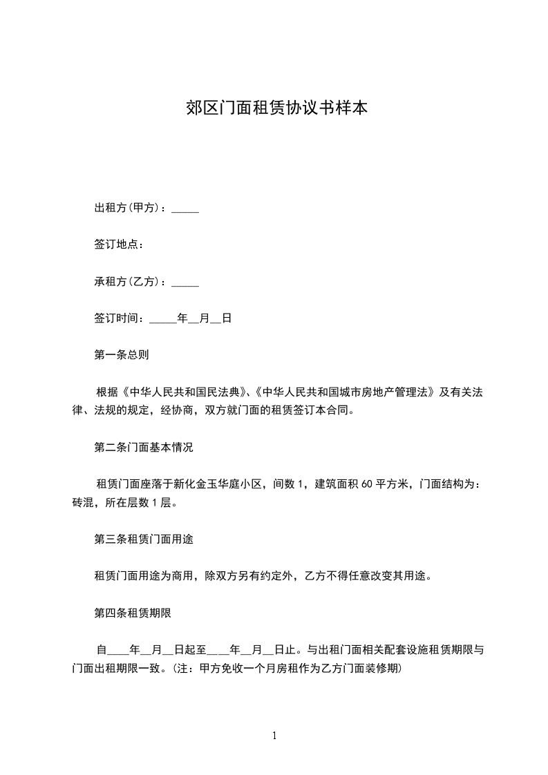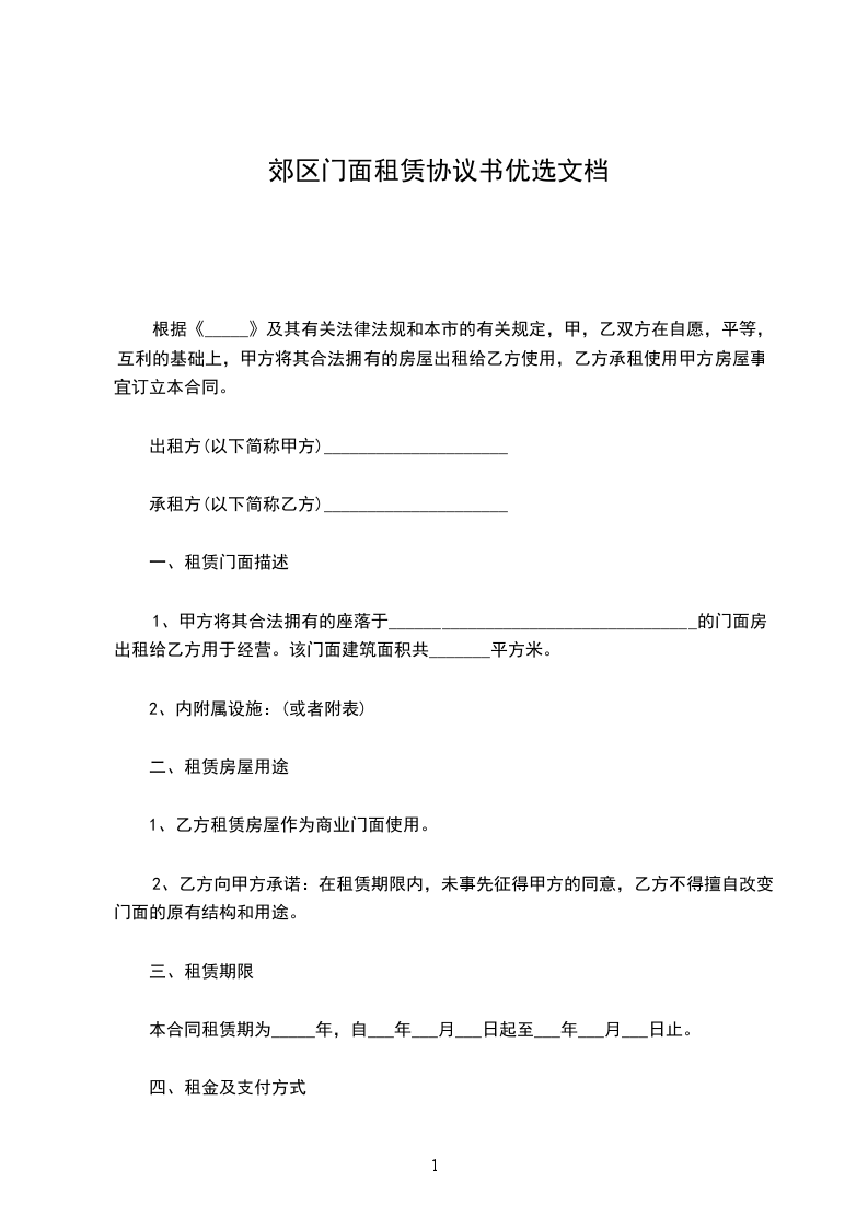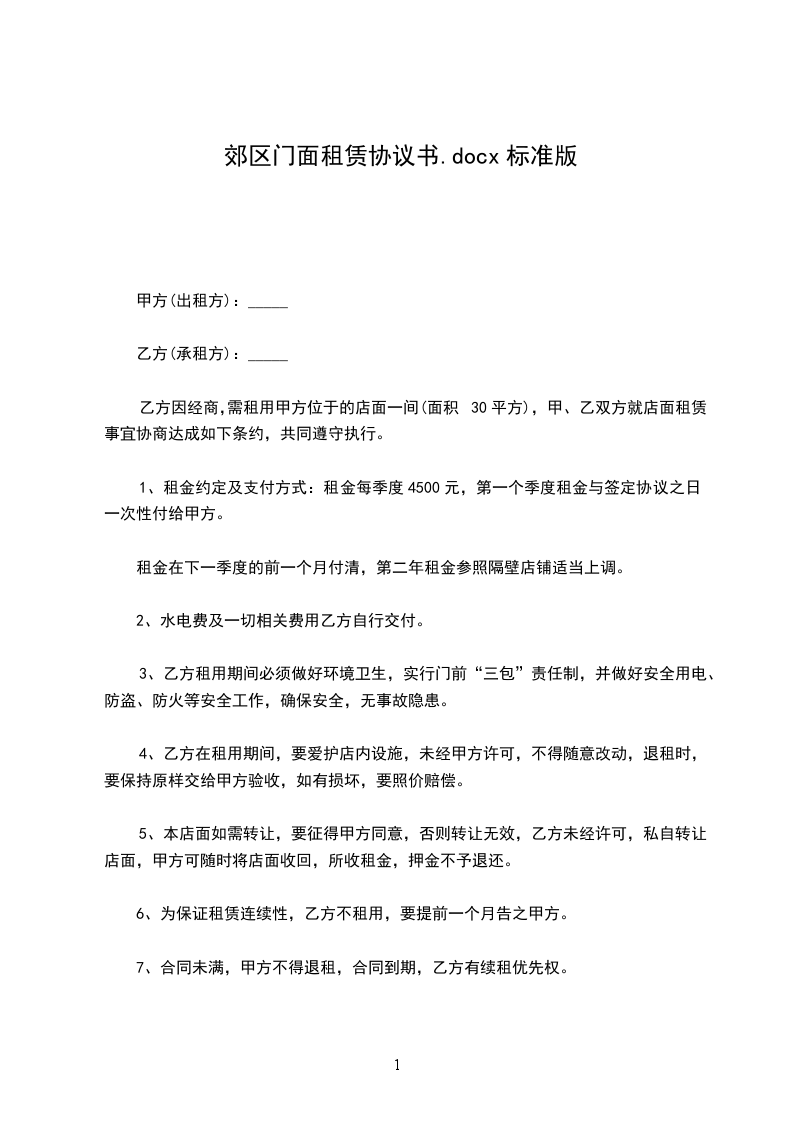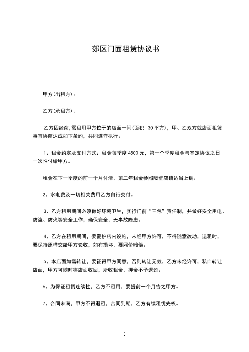 乙方因经商,需租用甲方位于的店面一间(面积30平方),甲、乙双方就店面租赁事宜协商达成如下条约,共同遵守执行。