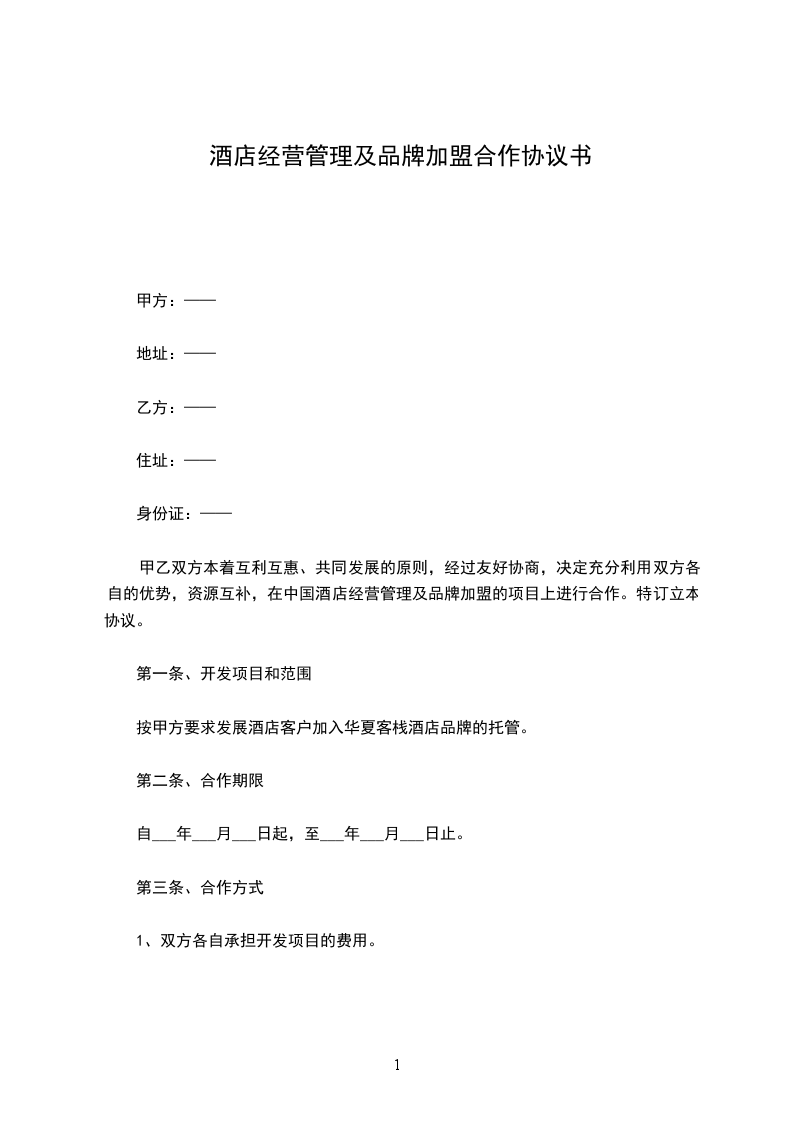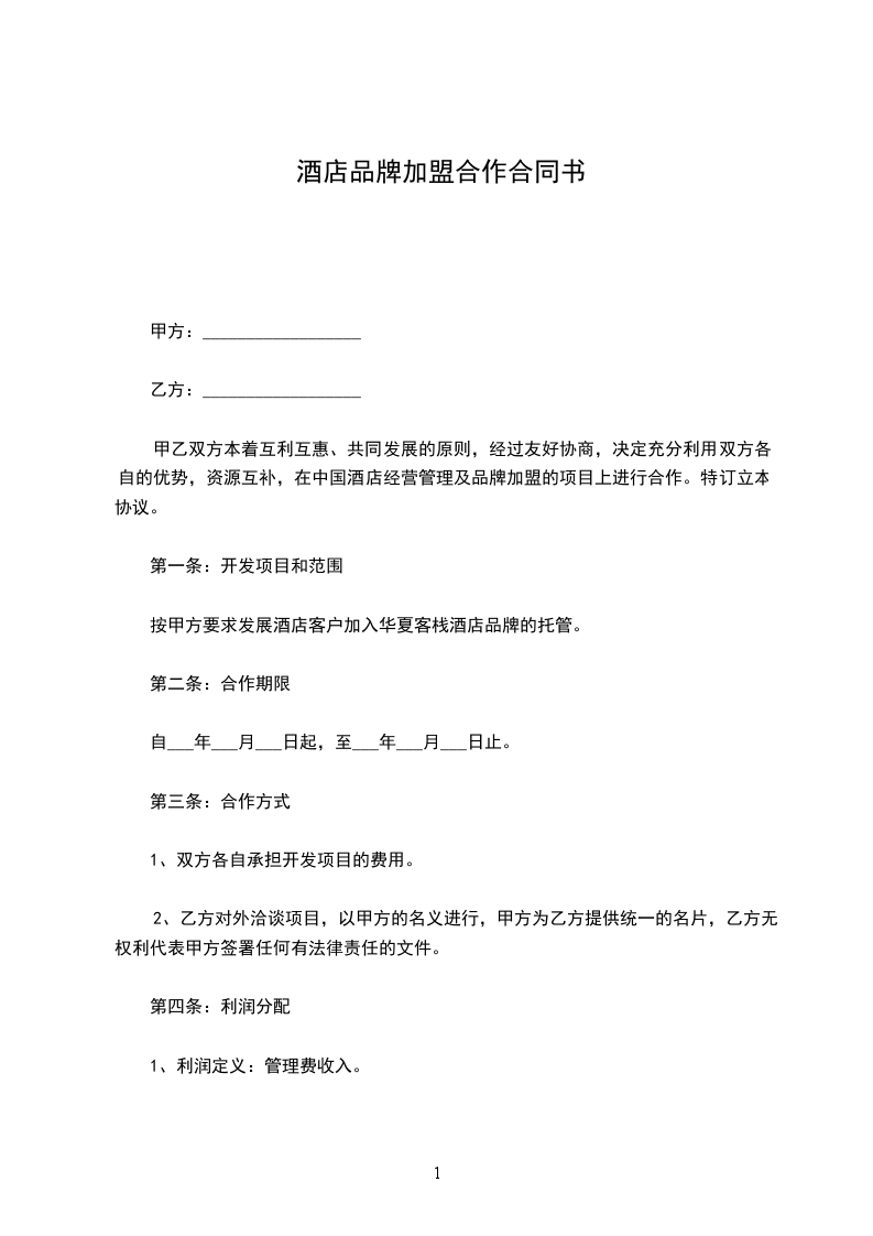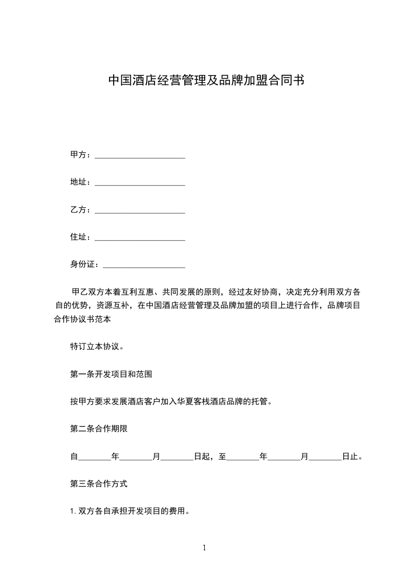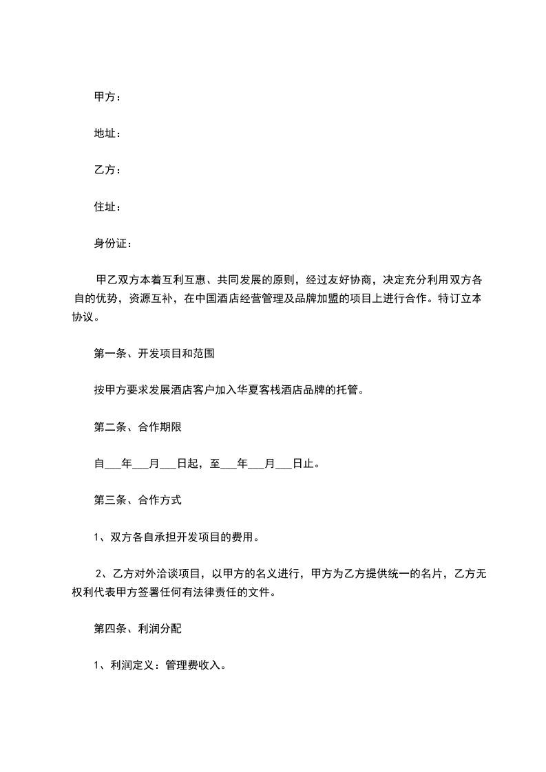 甲乙双方本着互利互惠、共同发展的原则,经过友好协商,决定充分利用双方各自的优势,资源互补,在中国酒店经营管理及品牌加盟的项目上进行合作,品牌项目合作协议书范本