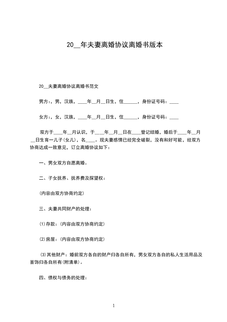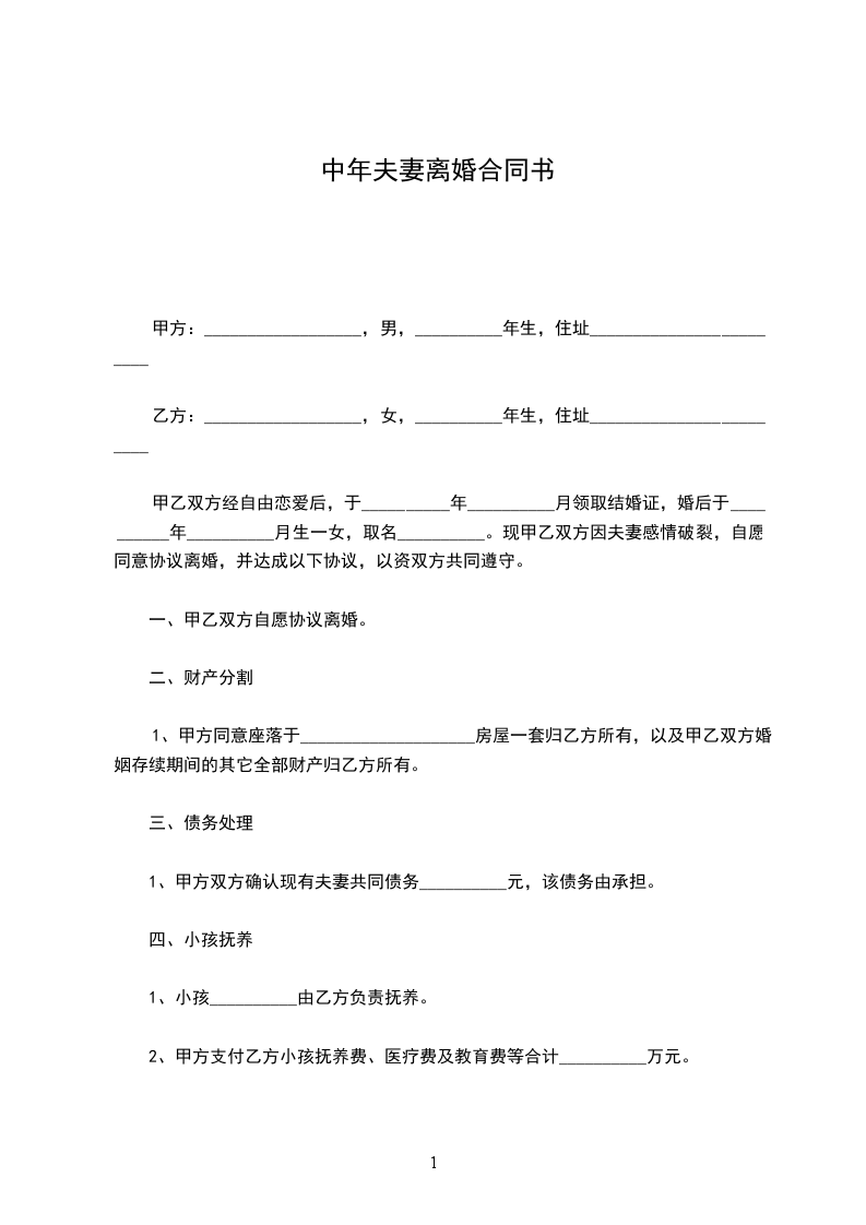 1、甲方同意座落于____________________房屋一套归乙方所有,以及甲乙双方婚姻存续期间的其它全部财产归乙方所有。