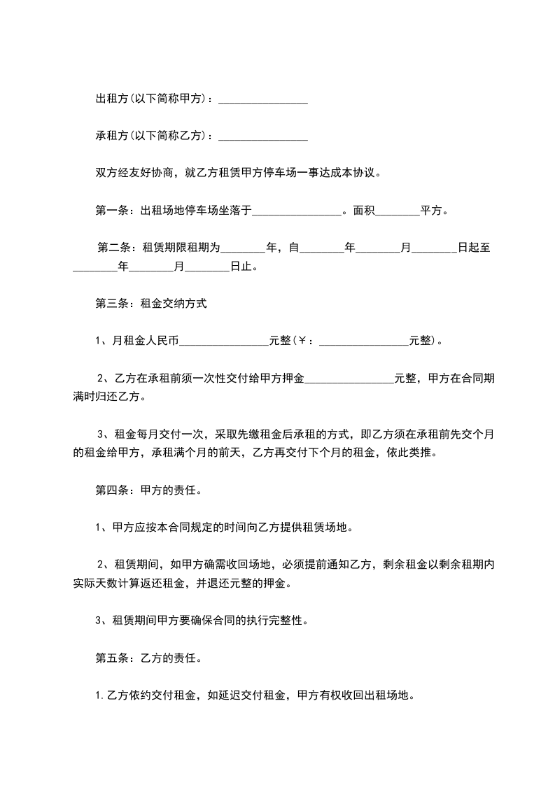 第一条:出租场地停车场坐落于________________。面积________平方。