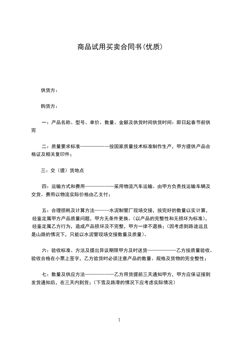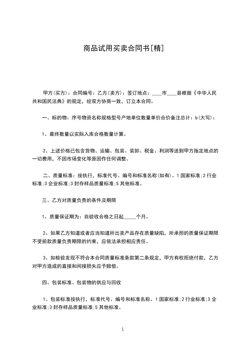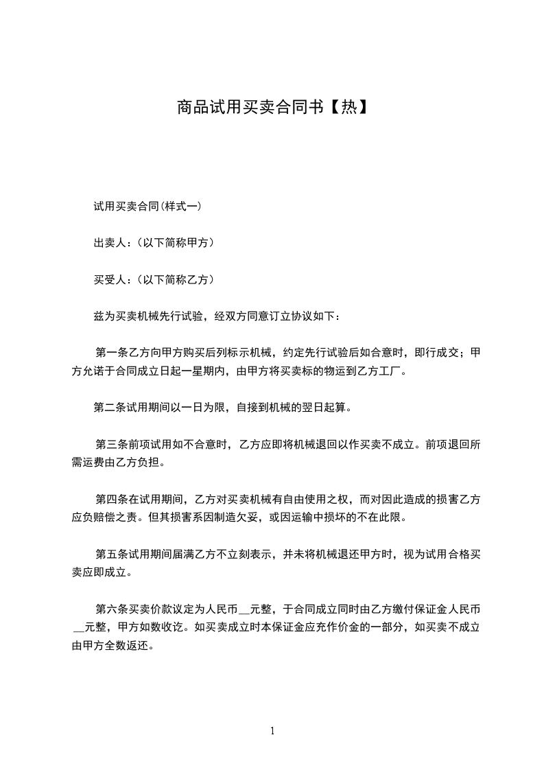 4.乙方应在试用结束后的_________日内把试用品归还甲方,逾期试用品视同以_________元价格售出。