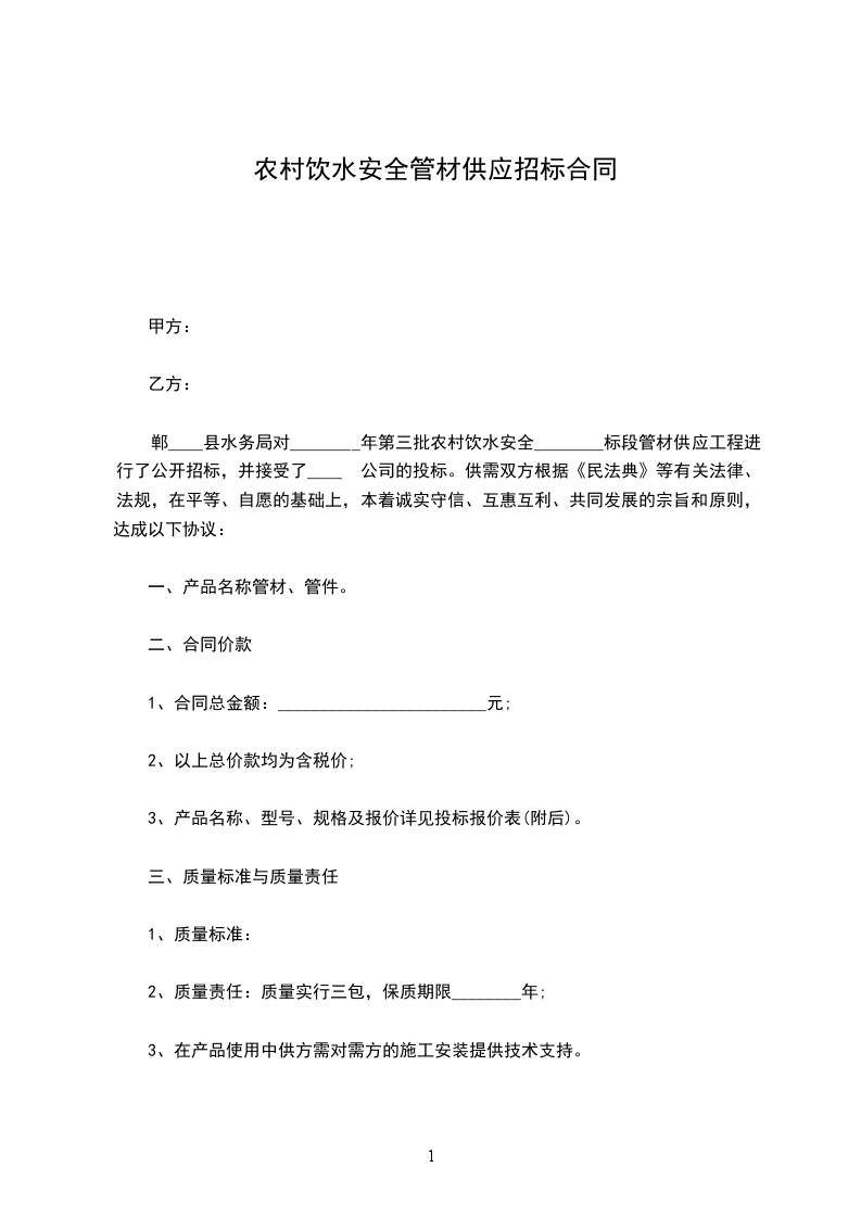 郸____县水务局对________年第三批农村饮水安全________标段管材供应工程进行了公开招标,并接受了____ 公司的投标。供需双方根据《民法典》等有关法律、法规,在平等、自愿的基础上,本着诚实守信、互惠互利、共同发展的宗旨和原则,达成以下协议: