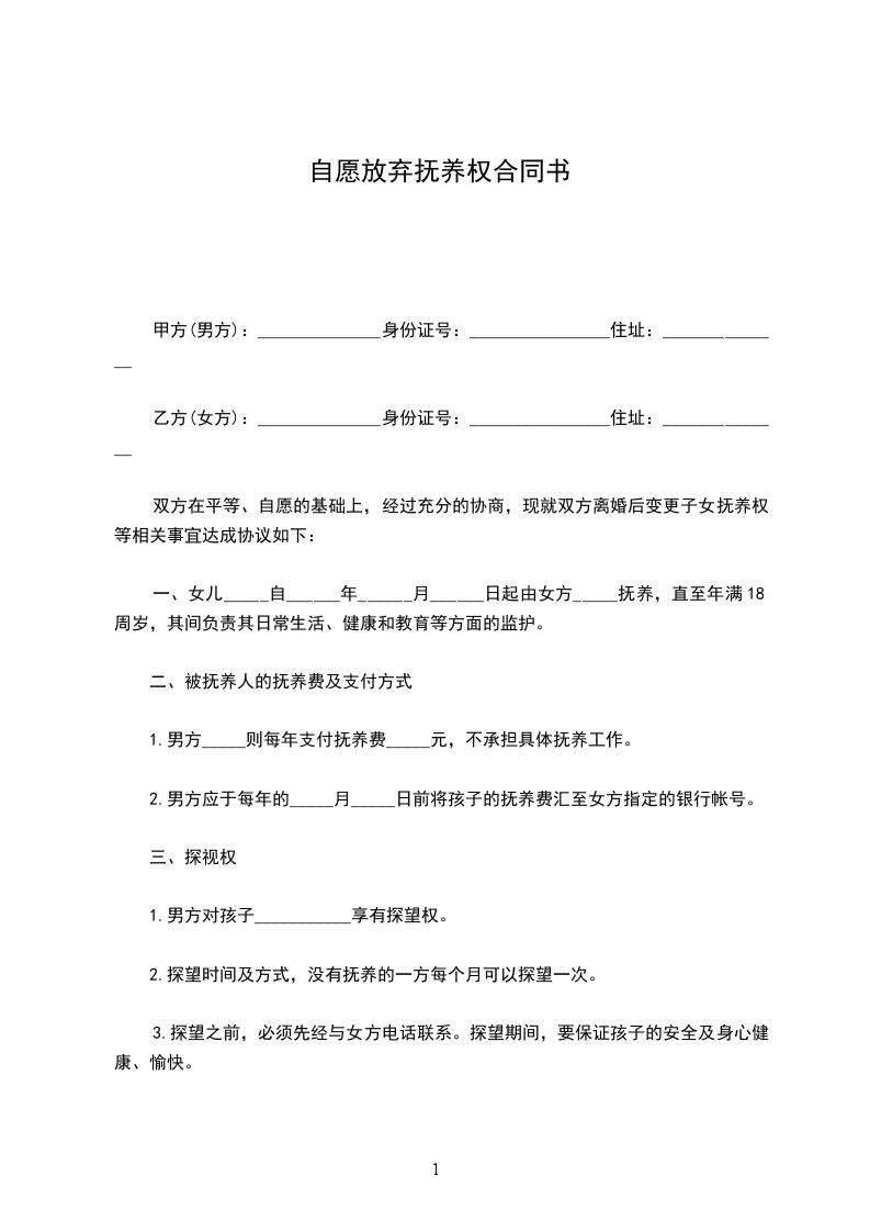 一、女儿_____自______年______月______日起由女方_____抚养,直至年满18周岁,其间负责其日常生活、健康和教育等方面的监护。