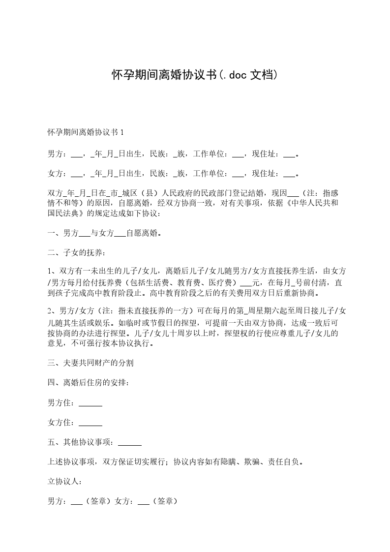 1、双方有一未出生的儿子/女儿,离婚后儿子/女儿随男方/女方直接抚养生活,由女方/男方每月给付抚养费(包括生活费、教育费、医疗费)__________元,在每月__________号前付清,直到孩子完成高中教育阶段止。